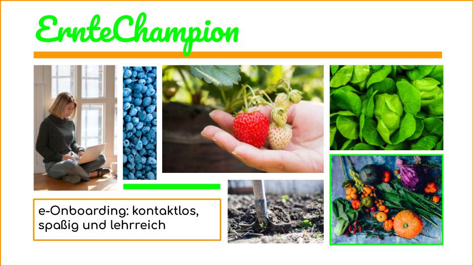 ErnteChampion bietet ein e-Onboarding für zukünftige ErntehelferInnen ohne Vorerfahrungen. Kontaktlos, lehrreich, spaßig - via Video-Tutorial zum Ernteprozess, Gemüseregister und vorherigem Eignungsfeststellungstest. Und ohne Mehraufwand für den Landwirt! ErnteChampion gewährleistet, dass sich auch wirklich nur geeignete Menschen als ErntehelferInnen melden, die durch unsere Onboarding-Website genau wissen, was eine solche Tätigkeit alles beinhaltet. Dies umfasst das richtige Mindset, eine gute körperliche Konstitution für harte Arbeit auf dem Feld, und natürlich ein landwirtschaftliches Grundwissen zu den wichtigsten Erntevorgängen.