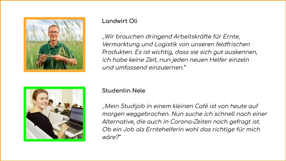 Wegen des Coronavirus können ernteerfahrene ArbeiterInnen aus den Europäischen Nachbarländern aktuell nicht nach Deutschland einreisen. Ernte und Jahresumsätze der hiesigen Landwirte sowie unsere Grundversorgung stehen auf dem Spiel. Gleichzeitig haben viele FreelancerInnen, KünstlerInnen und Aushilfskräfte durch die Corona-Pandemie kein Einkommen mehr. Es liegt auf der Hand, diese beiden Gruppen zu vernetzen! Es gibt bereits einige gelungene Matching-Portale, in denen potenzielle ErntehelferInnen an Landwirtschaftsbetriebe vermittelt werden, z.B. land-arbeit.com und erntehelfer-gesucht.de.