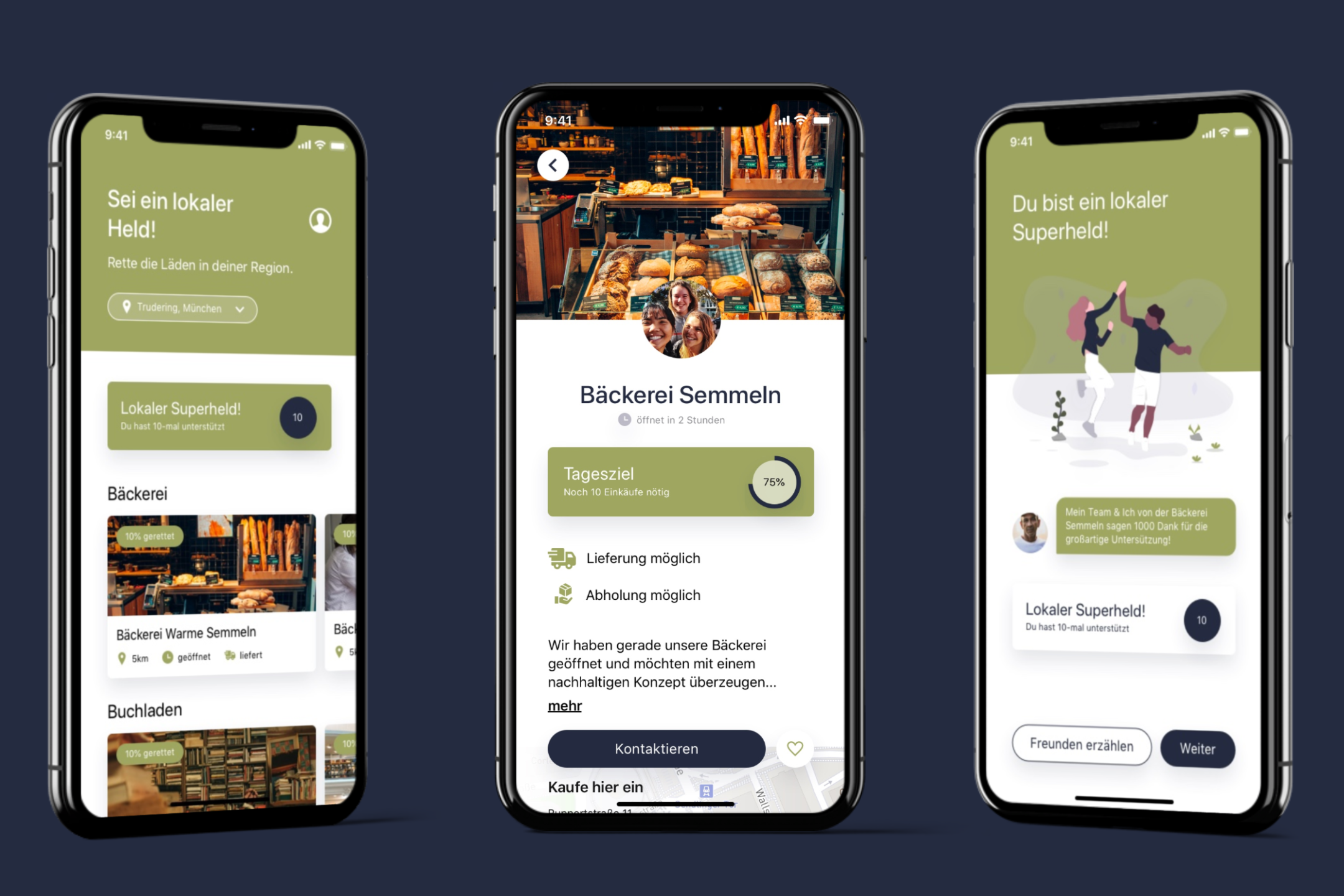 Unsere Vision ist es, die Vielfalt lokaler Geschäfte und Restaurants, die den Charakter unserer Heimatstädte prägen, über die Corona-Krise zu retten. Wir sind der Überzeugung, dass der Tante Emma Laden um die Ecke, unser liebstes Hipster-Cafe und die gemütliche Buchhandlung, die uns regelmäßig die Zeit vergessen lässt, der aktuellen Krise nicht zum Opfer fallen dürfen. Menschen, die unseren Alltag jeden Tag etwas schöner machen, indem sie diese Geschäfte betreiben, dürfen nicht ihre Existenzgrundlage verlieren. Wir sind sicher, dass viele Mitmenschen diesen Gedanken teilen und lokale Kleinunternehmen auch weiterhin durch ihre Einkäufe unterstützen möchten. Wir sehen als unsere Mission, all diese Gleichgesinnten zu lokalen Helden zu machen, indem wir ihnen Wege aufzeigen, wie sie durch ihren Einkauf einen Beitrag zur gemeinsamen Rettung der lokalen Vielfalt an Geschäften und Restaurants leisten können.