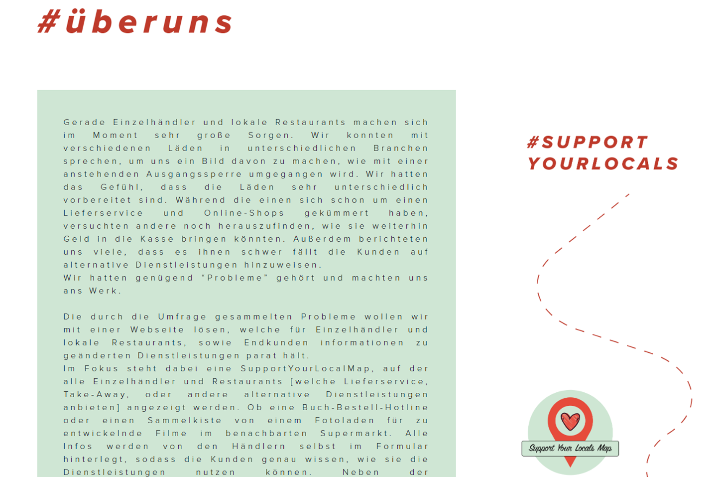 Die durch die Umfrage gesammelten Probleme wollen wir mit einer Webseite lösen, welche für Einzelhändler und lokale Restaurants, sowie Endkunden informationen zu geänderten Dienstleistungen parat hält. Alternativ: “Die Lösung: eine Webseite. Über eine Map werden jegliche Informationen bezüglich geänderter Vertriebswege von lokalen Einzelhändlern und Restaurants für den Endkunden parat gehalten.” Im Fokus steht dabei eine SupportYourLocalsMap, auf der alle Einzelhändler und Restaurants [welche Lieferservice, Take-Away, oder alternative Vertriebswege anbieten] angezeigt werden. Ob eine Buch-Bestell-Hotline oder eine Sammelkiste von einem Fotoladen für zu entwickelnde Filme im benachbarten Supermarkt. Alle Infos werden von den Händlern selbst im Formular hinterlegt, sodass die Kunden genau wissen, wie sie die Dienstleistungen nutzen können.