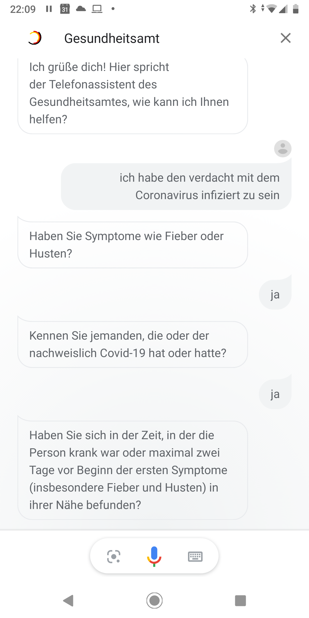 Ein intelligenter Telefonassistent der die Hotline der Gesundheitsämter entlasten soll indem häufig gestellte Fragen automatisch beantwortet werden - inbesondere mitteilen von Verhaltenstipps, aktuellen Informationen und Auskunft bei Infektionsverdacht. Außerdem soll den Beamt:innen des Gesundheitsamtes ein Dashboard bereitgestellt werden, mit dem sie die Ergebnisse der letzten Anrufe einsehen können um Sie bei Bedarf zurückrufen zu können.