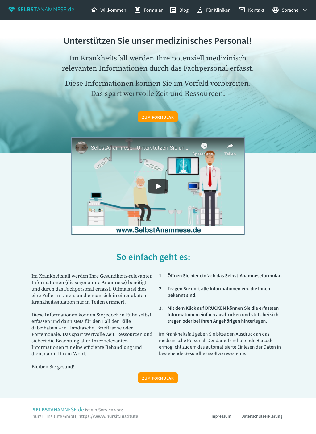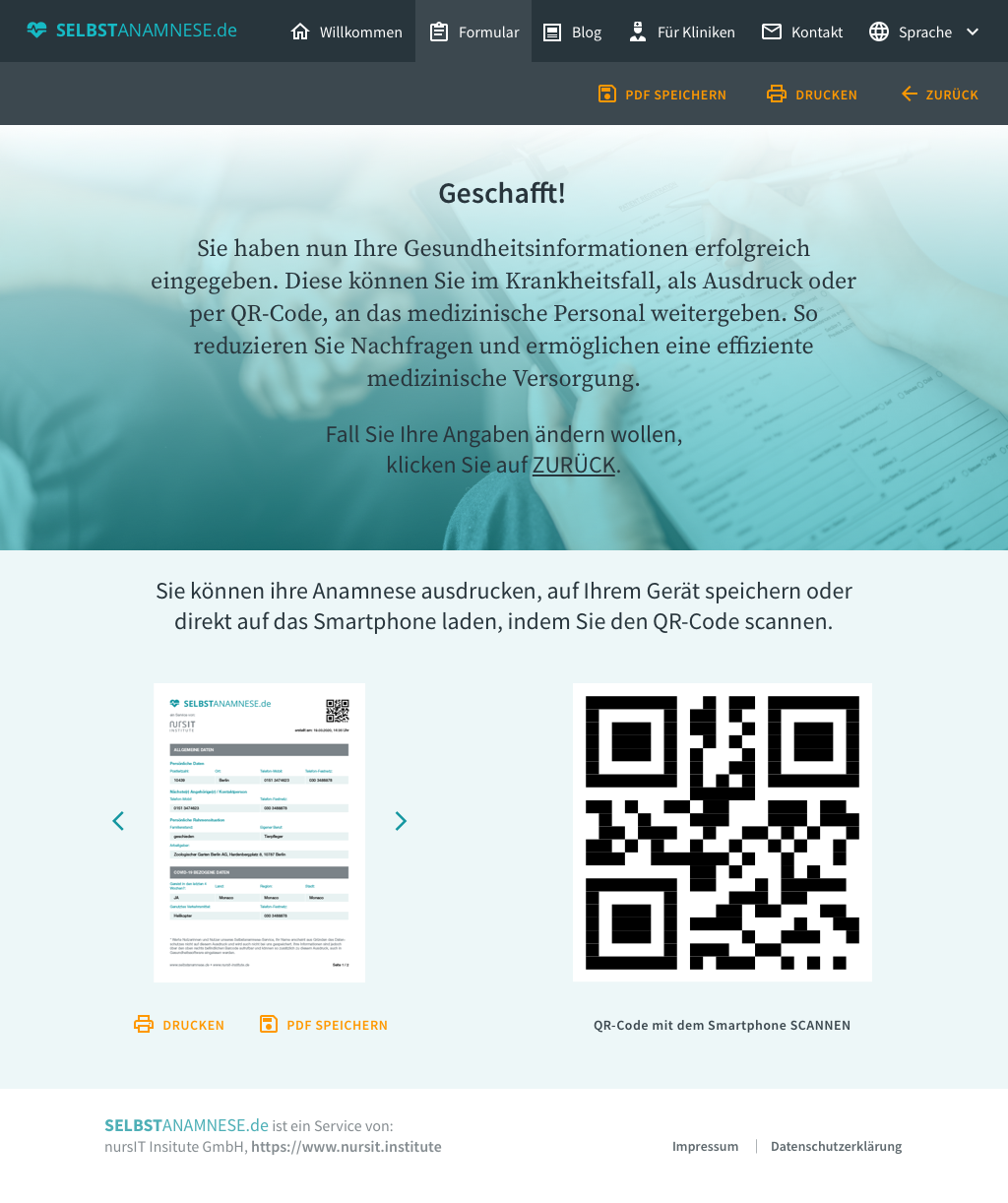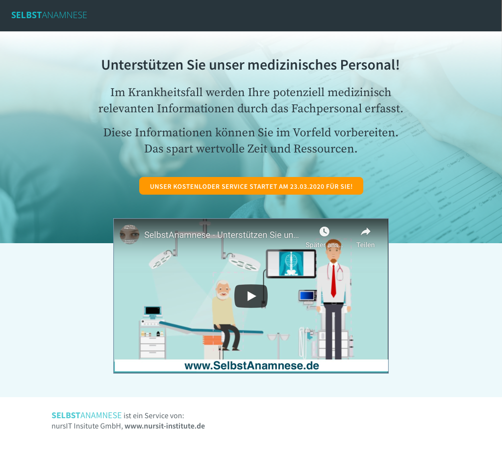 Mit dem neuen kostenlosen Onlineservice können genau diese Informationen schon im Vorfeld selbst erfasst werden – in Ruhe und wenn es einem noch gut geht. Auf der Internetseite www.selbstanamnese.de geht dies sehr einfach und man hat stets seine Anamnese für den Fall der Fälle, z.B. als Ausdruck in der Brieftasche oder im Smartphone, dabei. Der darauf enthaltende Barcode ermöglicht es zudem, die Anamnese von überall online aufzurufen und auch das automatisierte Einlesen der Daten in bestehende Gesundheitssoftwaresysteme (über HL7 und FHIR). Selbstverständlich werden alle Daten anonymisiert und verschlüsselt gespeichert.