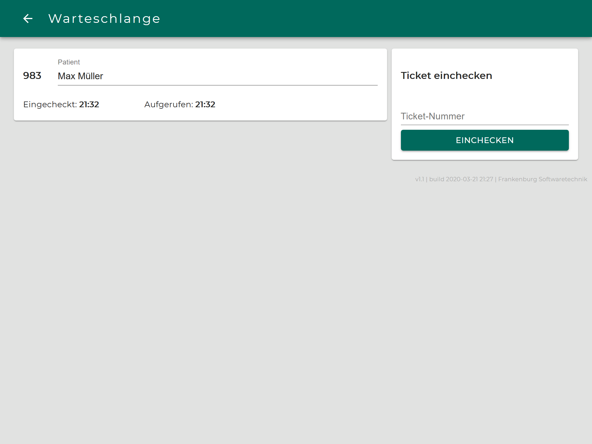 - Arzthelfer:in checkt Ticketnummer in Warteschlange ein; Patient:in erhält Bestätigung des Checkins