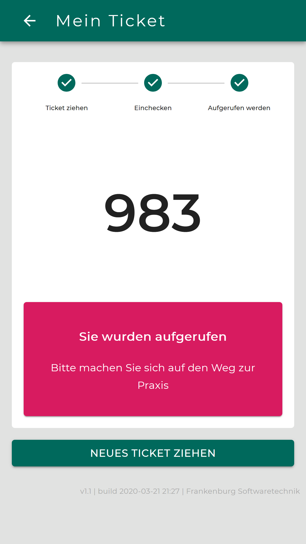 - Patient:in ziehen digitales Ticket mit Ticket-Nummer