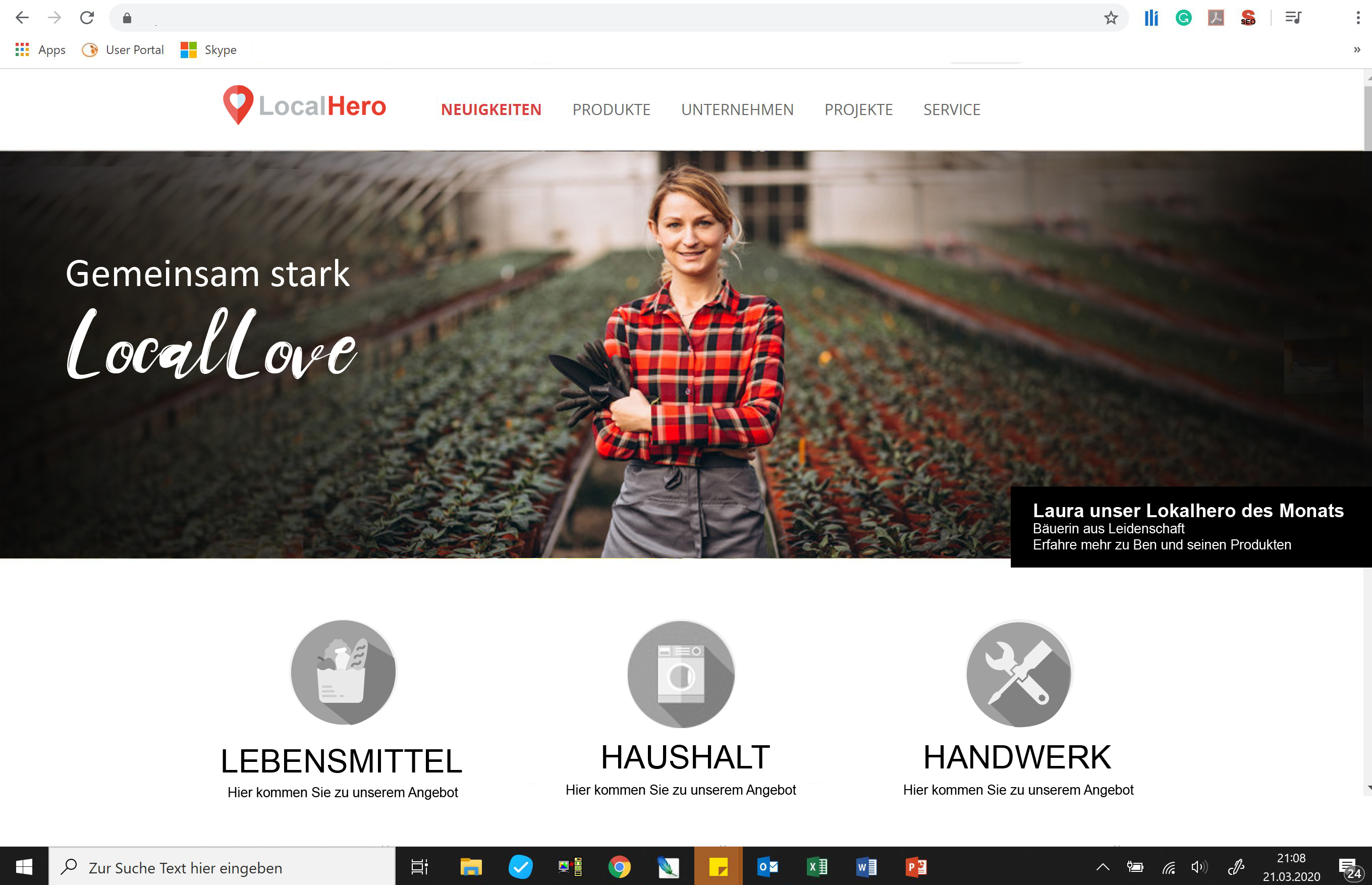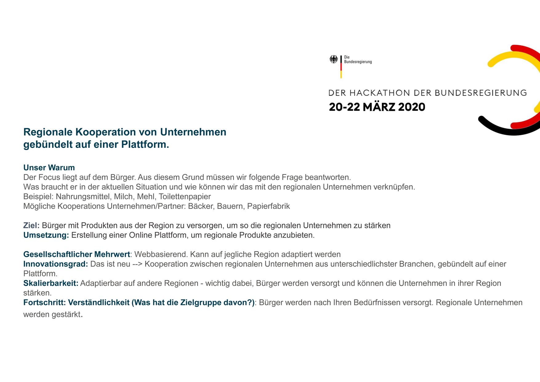 Gesellschaftlicher Mehrwert: Kann auf jegeliche Region adaptiert werden Innovationsgrad: Das ist neu --> Kooperation zwischen regionale Unternehmen unterschiedlichster Branchen gebündelt auf einer Plattform Skalierbarkeit: Adaptiere auf andere Regionen - wichtig dabei Bürger werden versorgt und können Ihre Region stärken Fortschritt: Verständlichkeit (Was hat die Zielgruppe davon?): Wir möchten kleinen Händlern, Herstellern, etc. eine einfache Möglichkeit geben, lokal Ihre Produkte zu vertreiben. Bürger werden nach Ihren Bedürfnissen versorgt. Regionale Unternehmen werden gestärkt.