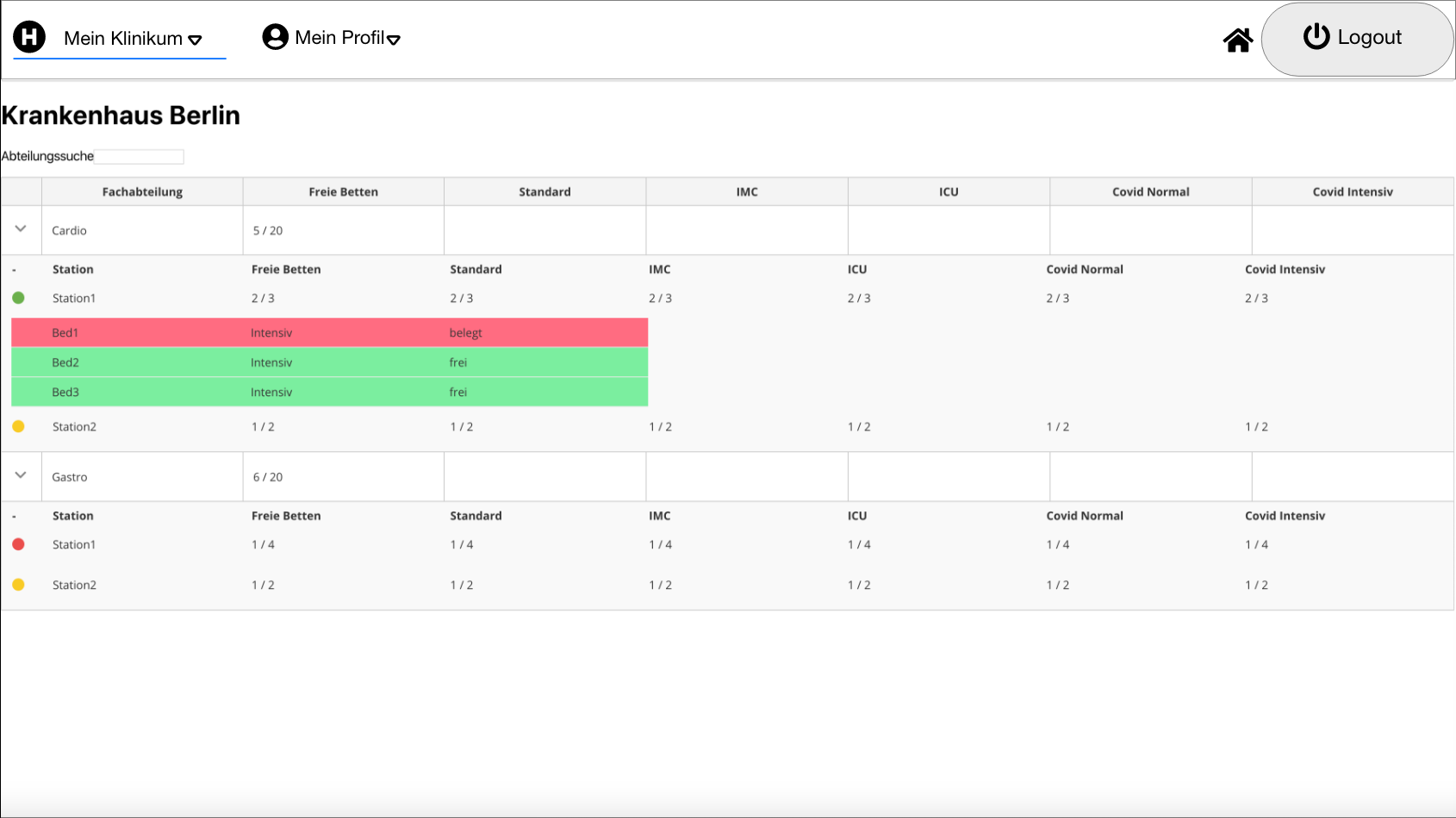 - Unterteilung in Fachabteilung, Bettentyp und Möglichkeit zur Aufnahme von Covid-19 Patienten