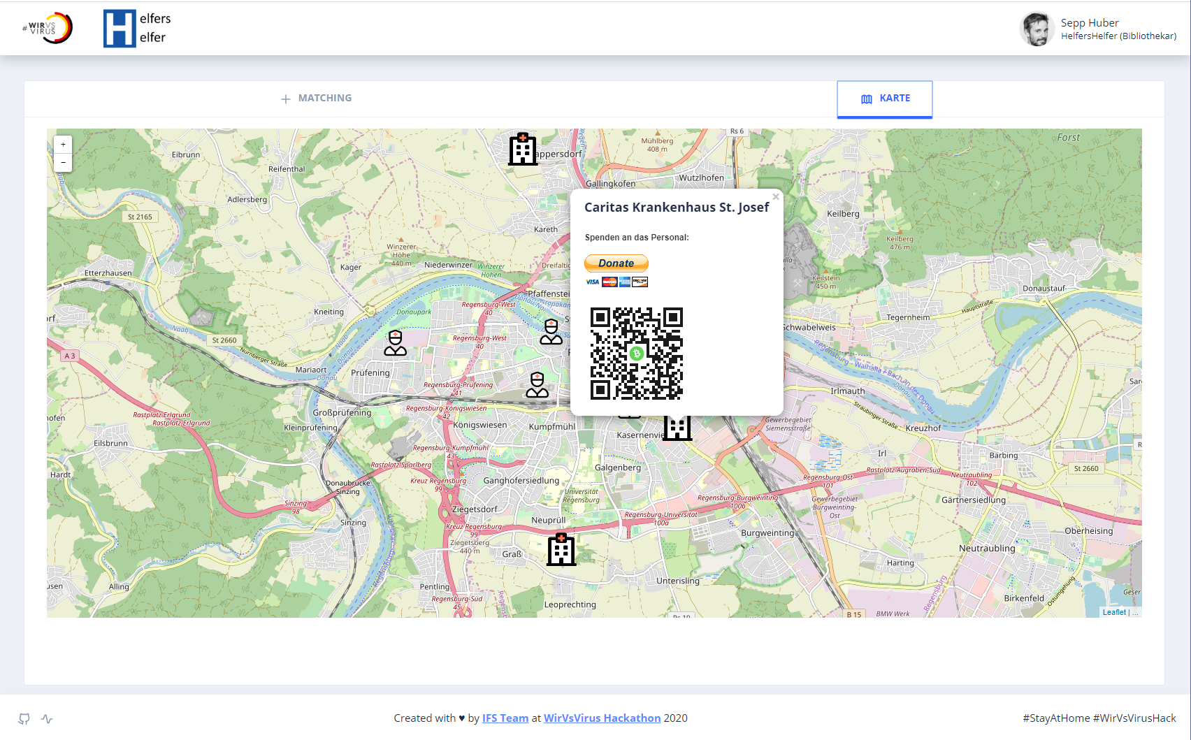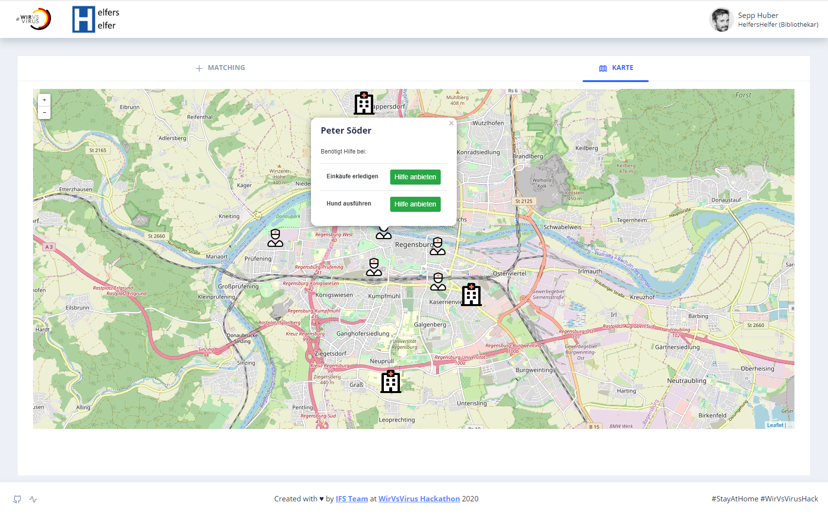 Im Prototypen sind wir insbesondere stolz auf die gelungene Oberfläche, wie z.B. Matching-Ansicht für Helfer und OpenStreetMaps-Karte.