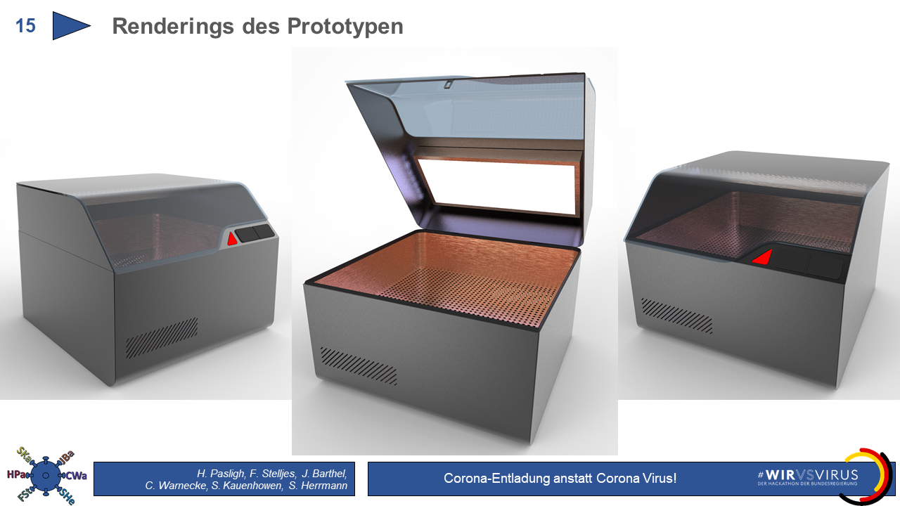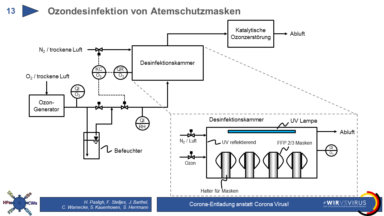 In Krankenhäusern kommt es aktuell zu einem Mangel an geeigneten Atemschutzmasken für das medizinische Personal. Die Masken sind Einmalprodukte und werden inzwischen von einem Mitarbeitenden beim Kontakt mit mehreren Patienten genutzt, um den Verbrauch zu reduzieren. Wir wollen mit unserem Projekt das Problem angehen und die Masken durch ein kombiniertes Verfahren aus Ozon-Gas und UV-Strahlung wieder desinfizieren und für eine weitere sichere Verwendung benutzbar machen.