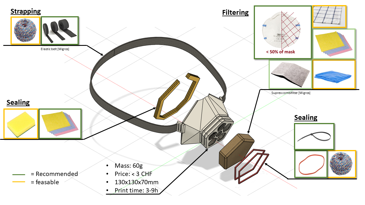 We would like to talk with some of our professors if it would be possible to use our university location to 3d print or injection molding some masks. For the filters we would like to test some ordinary household products for filtering efficiency. To test the household products, we need a cooperation with a higher education institute or a testing place for safety masks. We also asking our local government Rapperswil-Jona for financial support to compensate the costs.