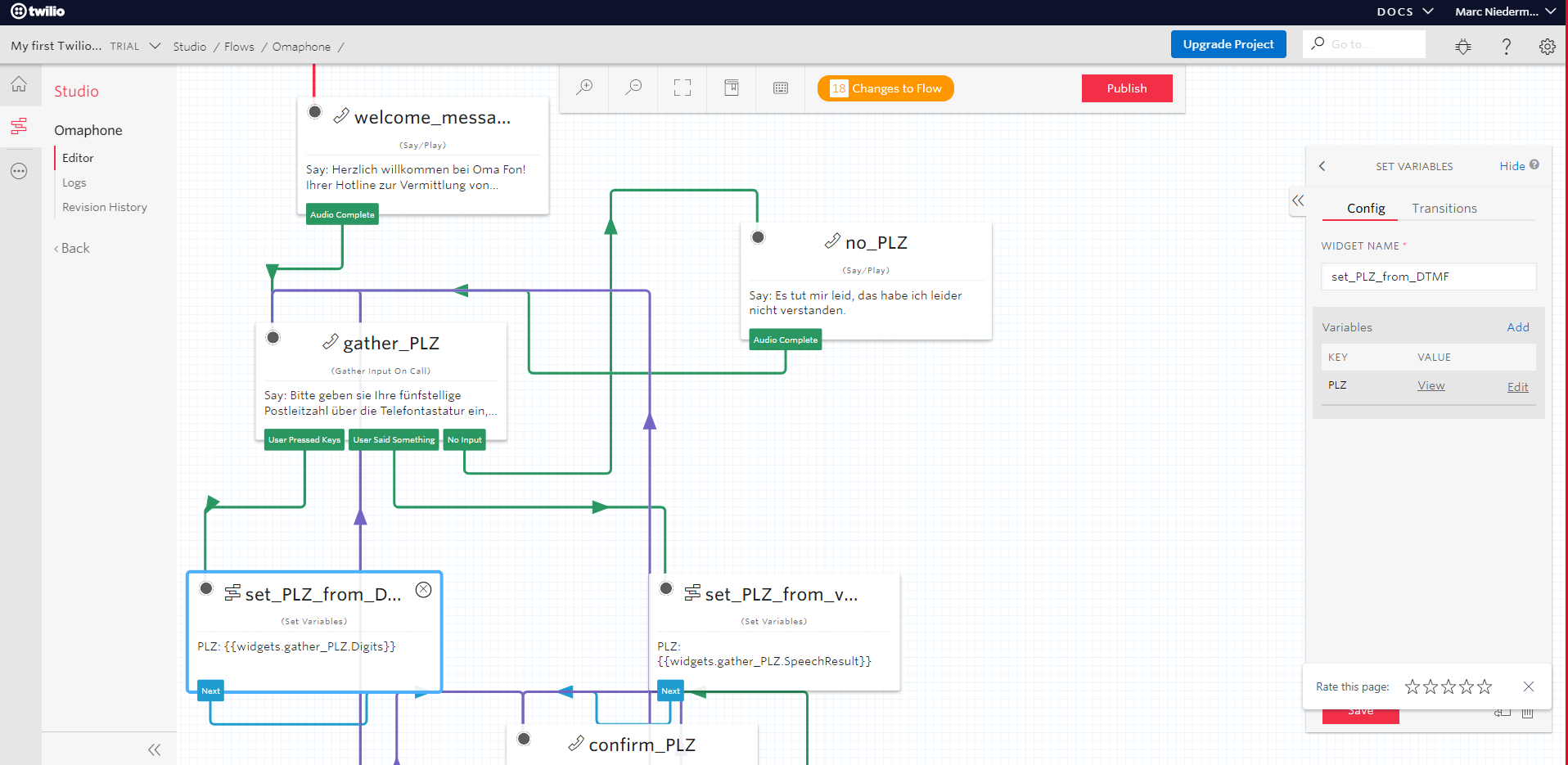 Die automatisierte Omaphon-Hotline wird über die Cloud-Kommunikationsplatform Twilio abgewickelt. Dabei ist im Twilio Studio ein Workflow generiert worden, der von Twiilio gehostet wird & den Prozess eines Anrufs bei der Hotline abbildet. Zunächst ist für den Hackathon ein Testaccount angelegt worden, der lediglich eine amerikanische Nummer besitzt. Die Verwendung war aufgrund der Verifizierungsdauer im Rahmen des Hackathons nicht umsetzbar.