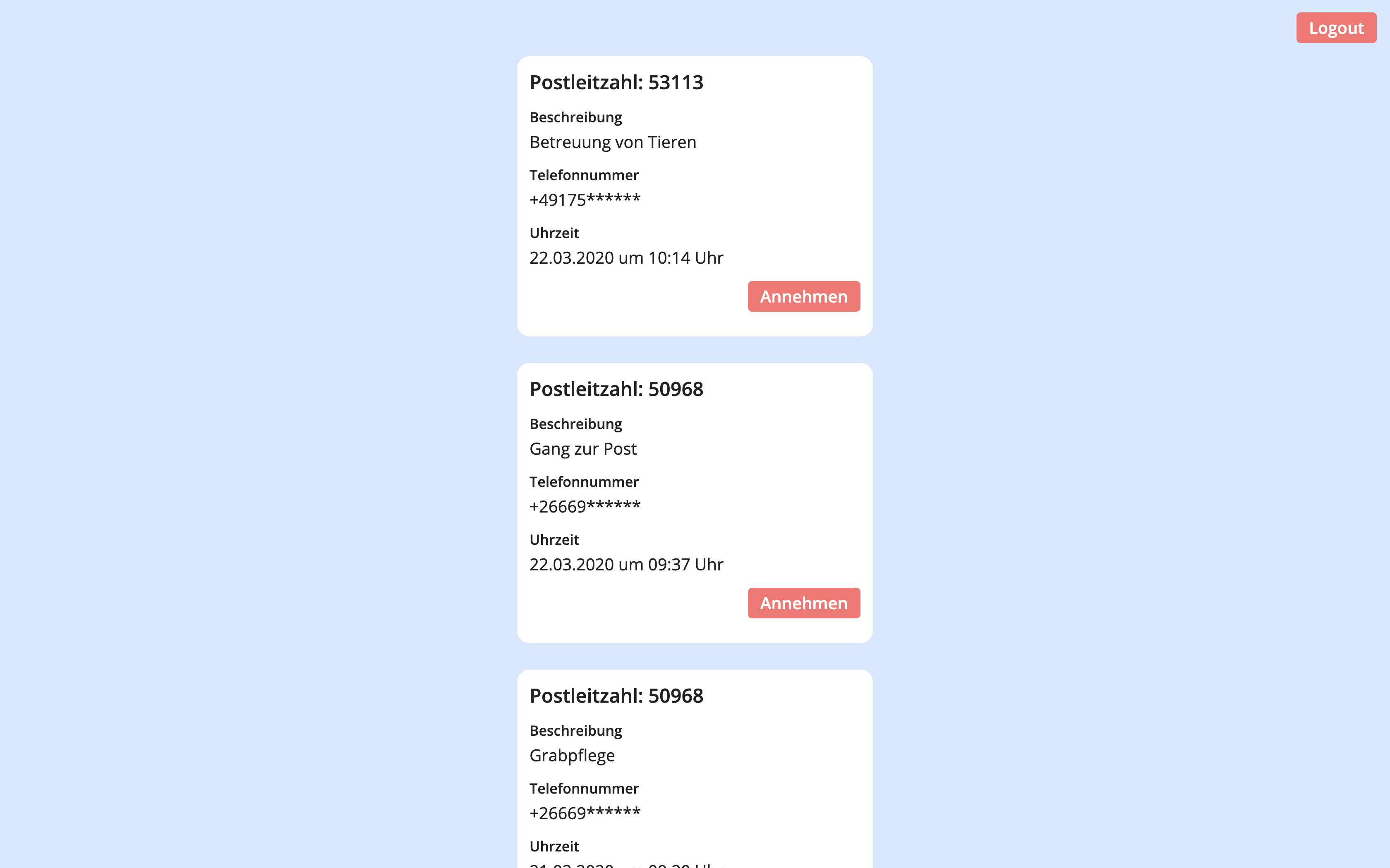 Die Helfer können sich ein passendes Hilfegesuch ansehen und die Person telefonisch kontaktieren. Auf diese Art und Weise wird eine direkte Kommunikation zwischen Hilfesuchendem und Hilfebietendem ermöglicht.