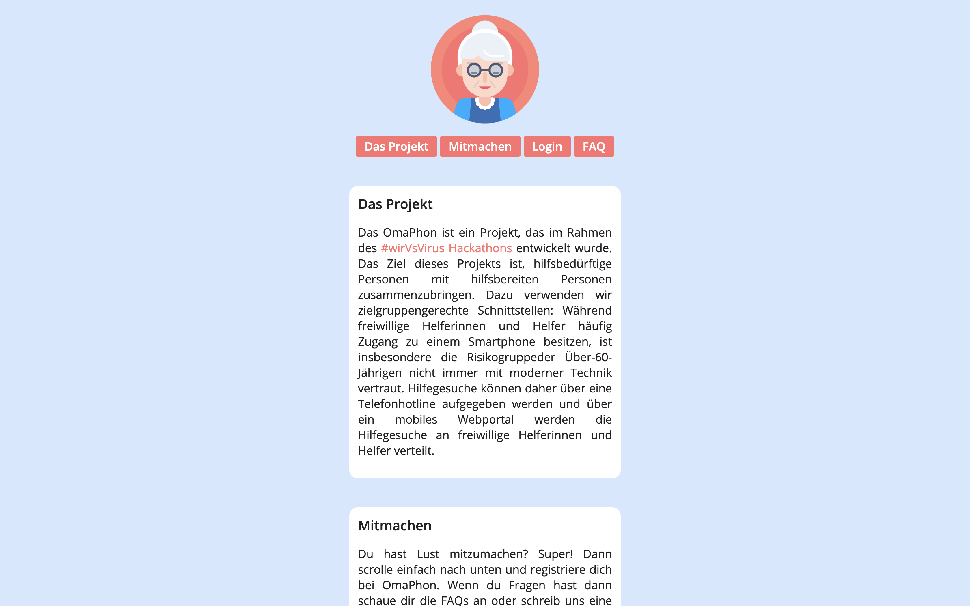 Im Fall der Nachbarschaftshilfe ist dies nur bedingt der Fall. Aus eigener Erfahrung wissen wir, dass es genügend angemeldete Hilfeleistende gibt, aber es an Mitmenschen mangelt, die der Risikogruppe entsprechen und Hilfe suchen. Da ein hoher Prozentsatz der Risikogruppe aus Menschen von über 60 Jahren besteht, haben wir unsere Großeltern befragt & uns ist dabei aufgefallen, dass dies nicht durch Facetime/Whatsapp-Call oder Skype möglich ist. Aus diesem Grund haben wir den Gap im Medium zur Anmeldung auf der Plattform als größtes Problem identifiziert. Unsere Lösung "omaPhon" soll die Risikogruppe mit der digitalen Kommunikation verbinden.