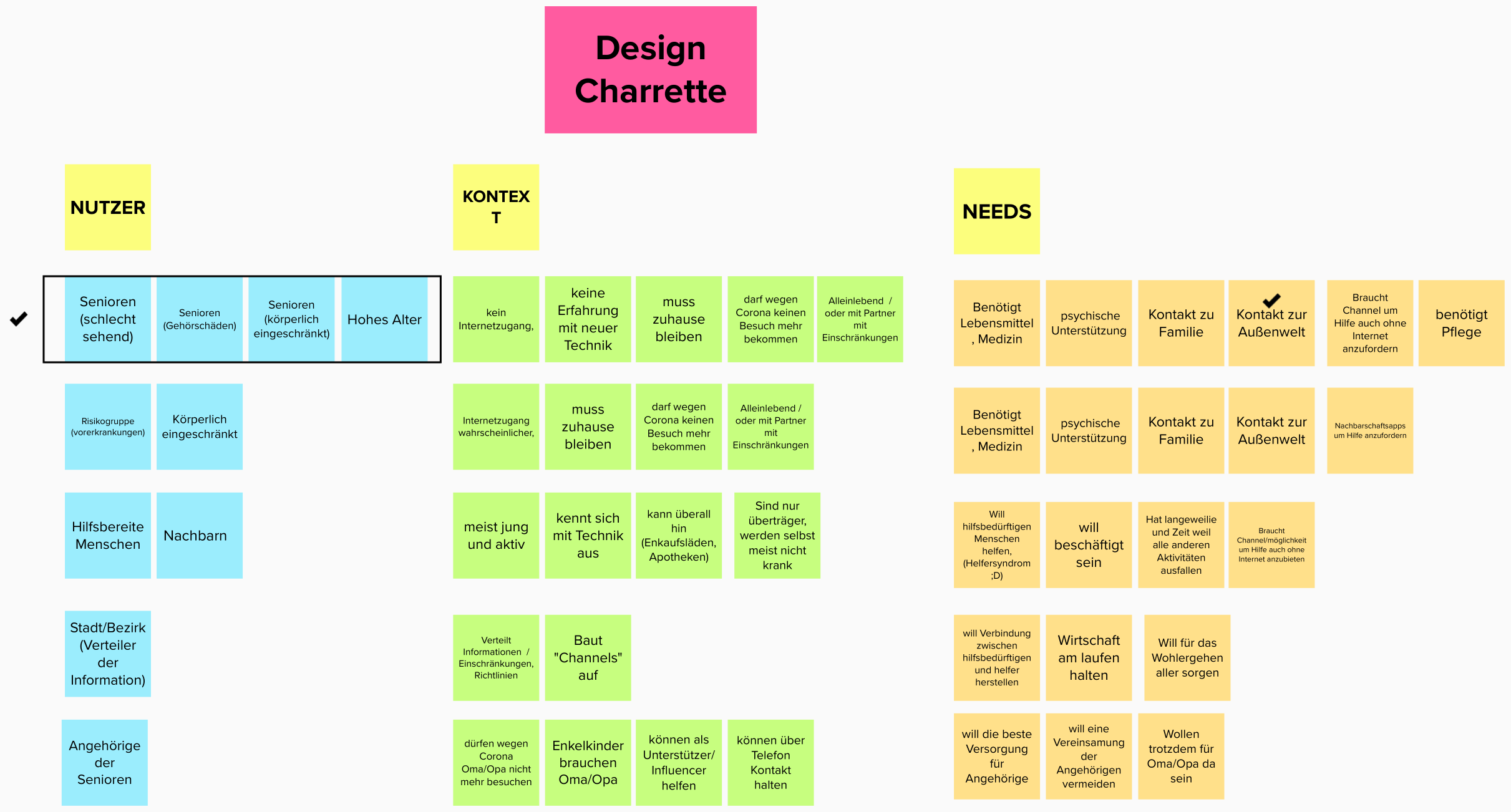 Als erstes haben wir versucht unsere Challenge/ Nutzer/ Needs mittels einer Design Charrette besser zu verstehen. Eine semantische Analyse hat uns geholfen unsere Design Challenge noch tiefer zu verstehen.