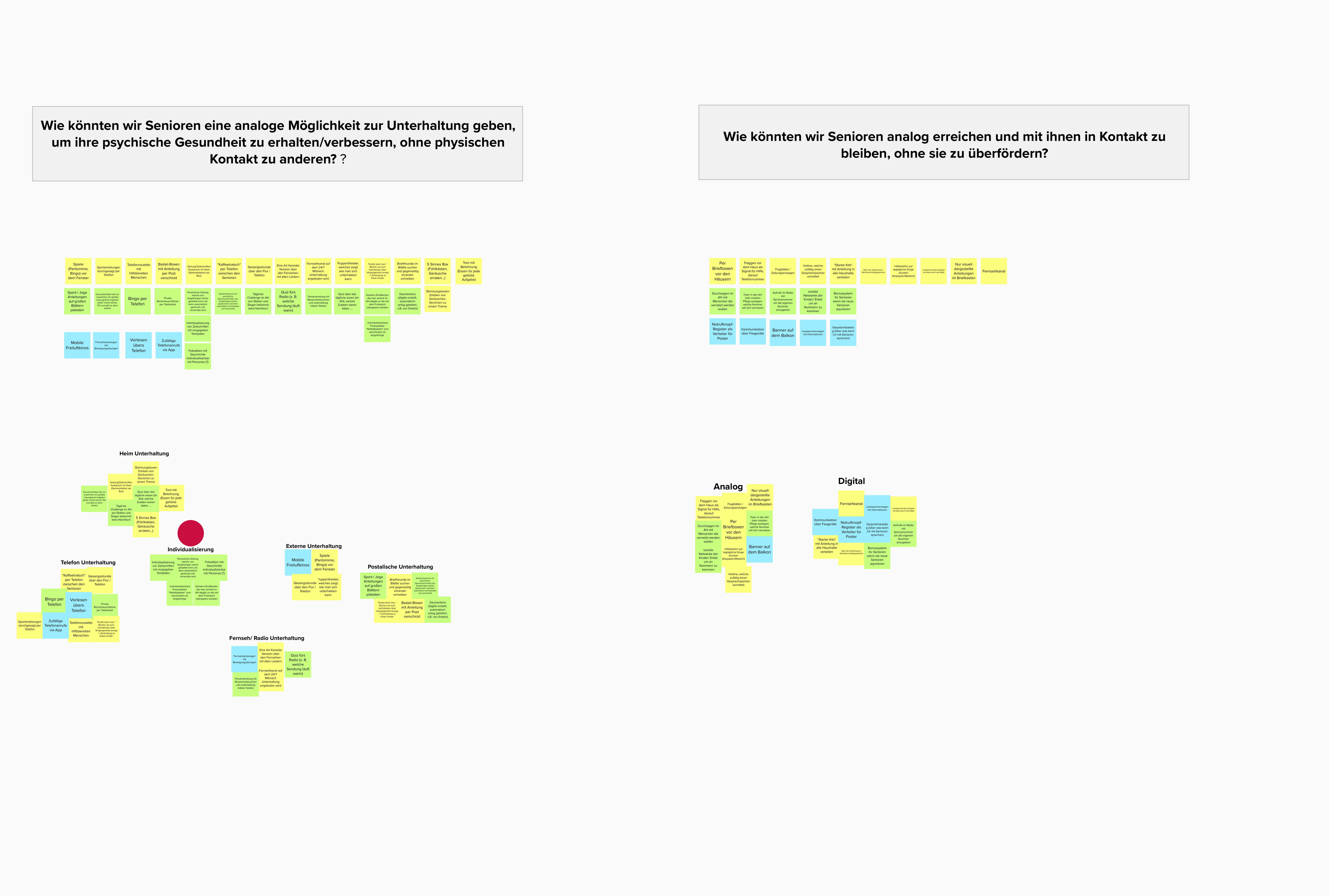 Wir haben uns anschließend auf eine Zielgruppe geeinigt und haben daraus viele "Wie könnten wir"- Fragen gestellt. Dann mussten wir wieder konvergieren und sind mit 2 WKW- Fragen in die Ideation gegangen.