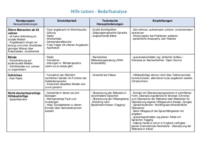 - Welche technischen Herausforderungen entstehen für die Plattformen bei der Nutzung der Plattform durch die jeweilige Zielgruppe, der Nutzung der Plattform durch Lotsen / Hilfsorganisationen, dem Matching zwischen Hilfesuchenden und Helfenden in Bezug auf die jeweilige Zielgruppe?