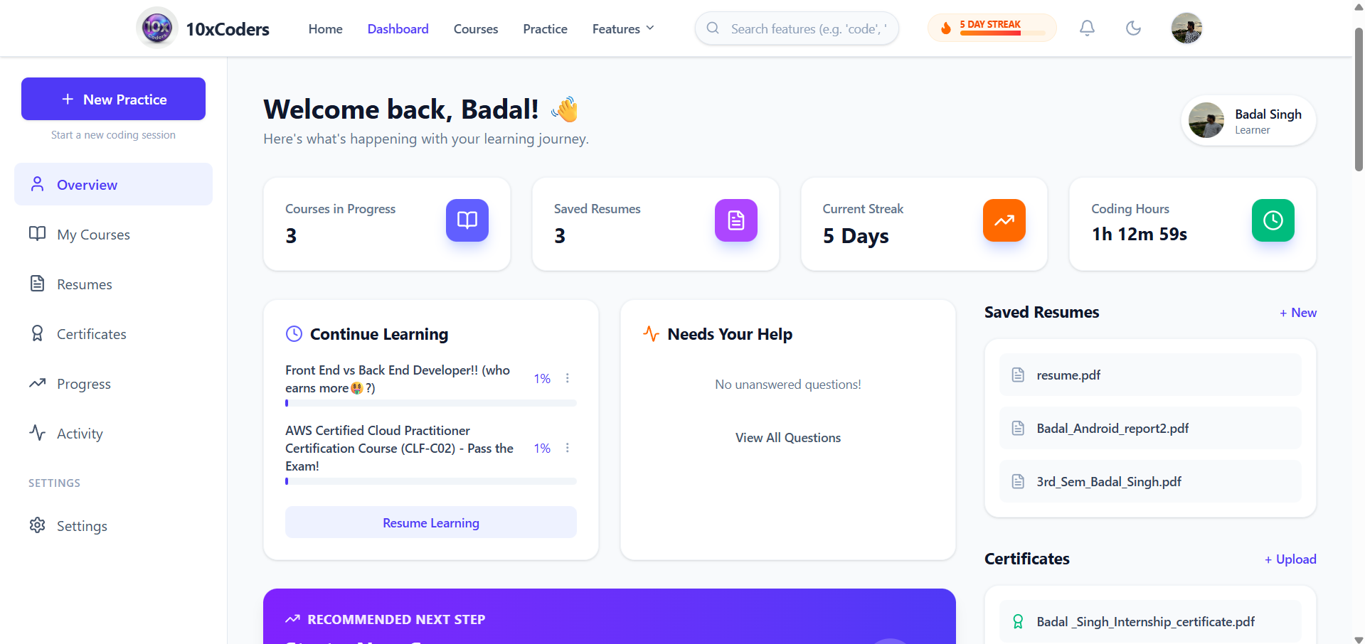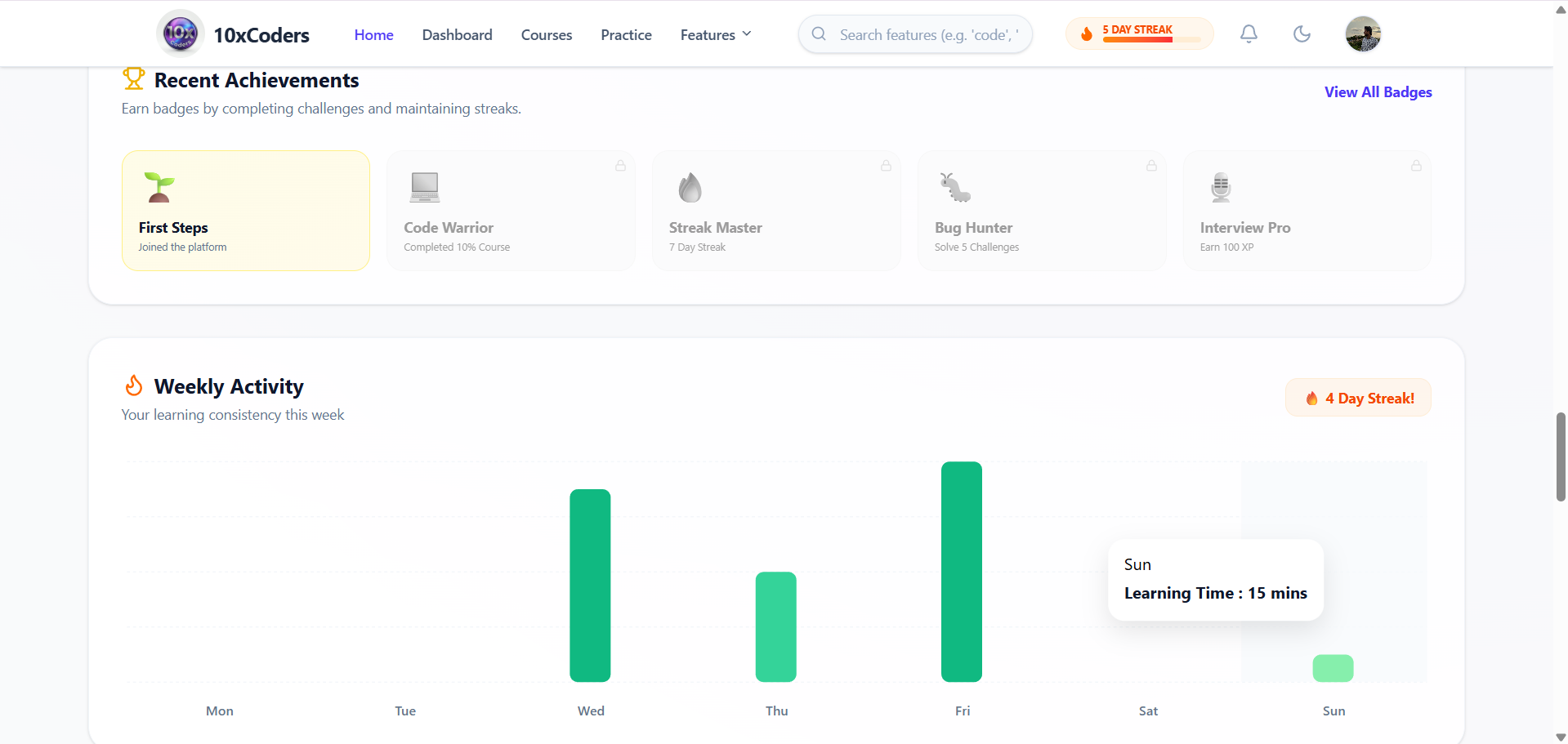 A centralized dashboard showing learning progress, streaks, activity history, achievements, and personalized recommendations—all in one place.