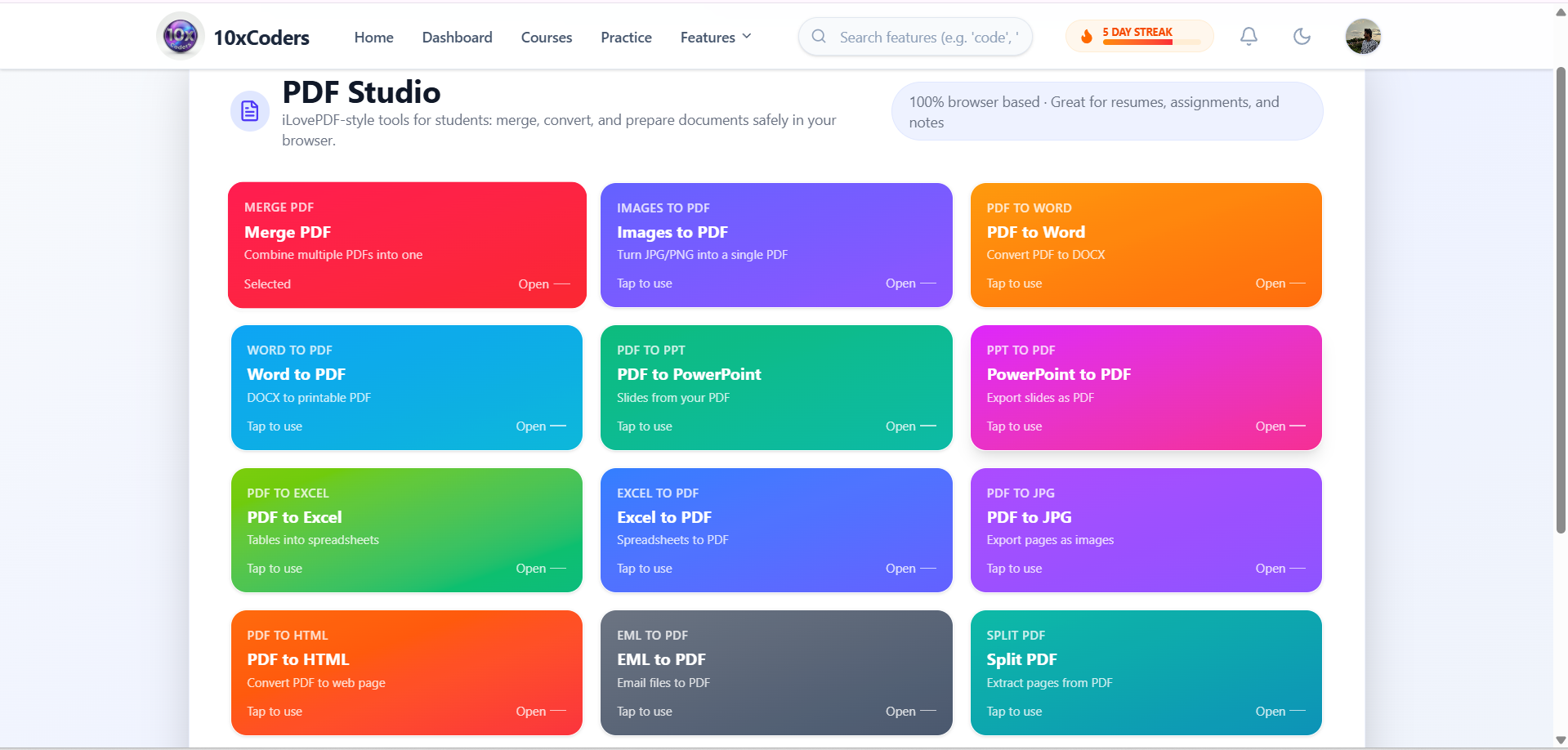 Convert, merge, split, and manage PDFs directly within the platform—useful for resumes and documents.