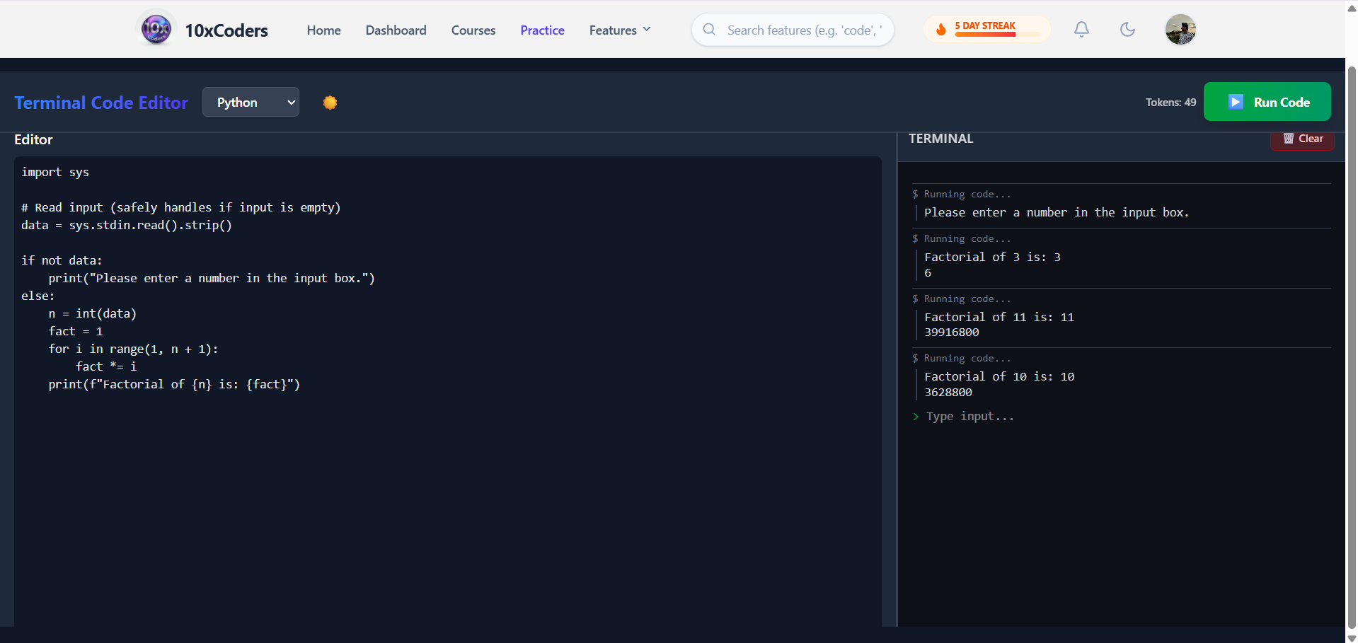 Live code editor supporting multiple languages to practice coding directly in the browser.