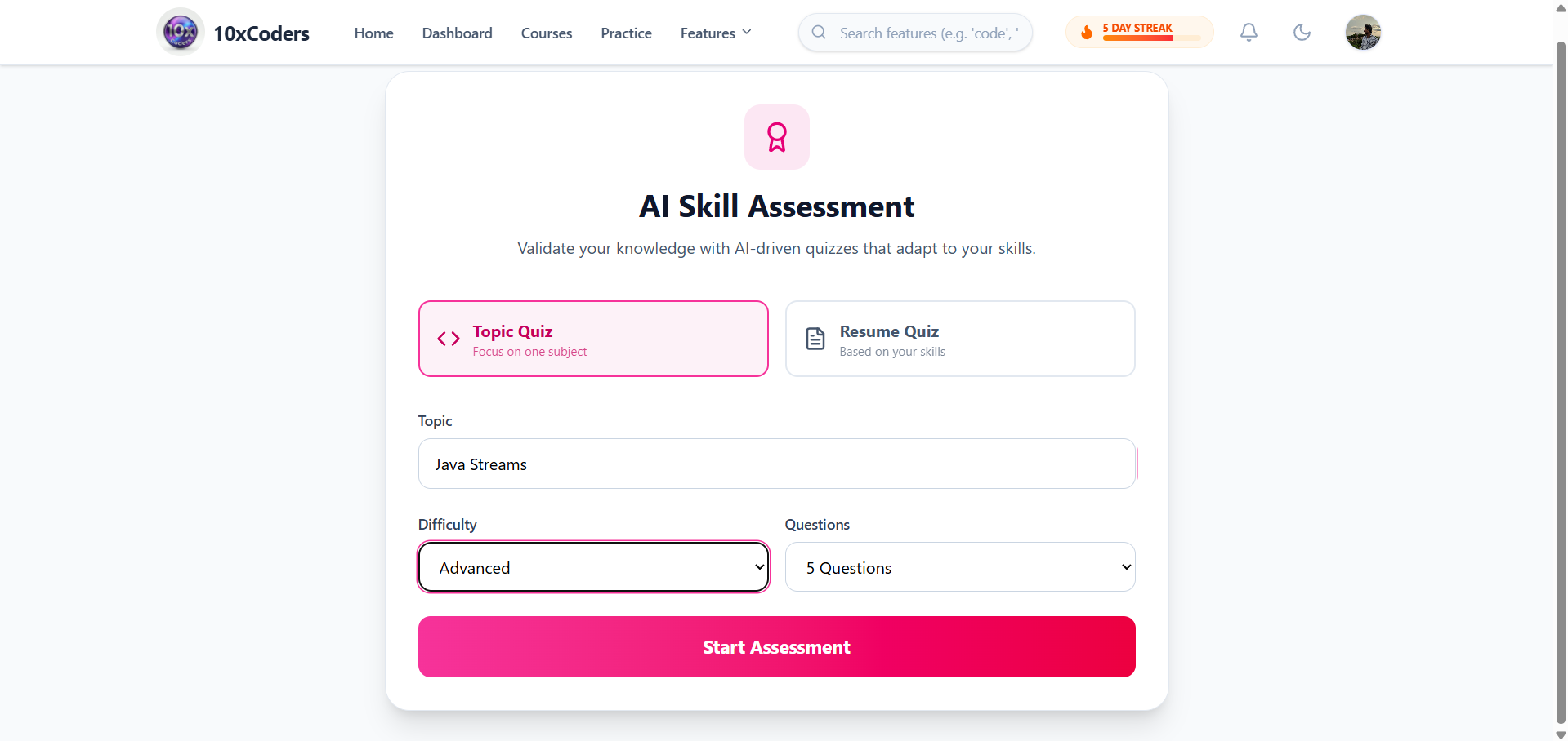 Automatically generated quizzes based on user skill level to identify strengths and improvement areas.
