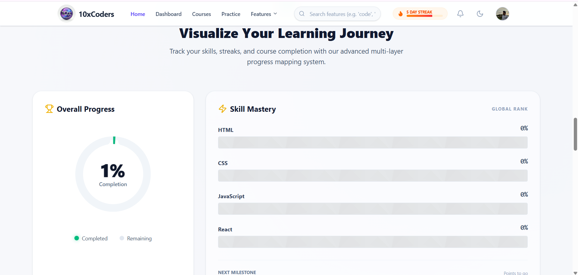 Visual dashboards showing learning streaks, skill mastery, and performance analytics.