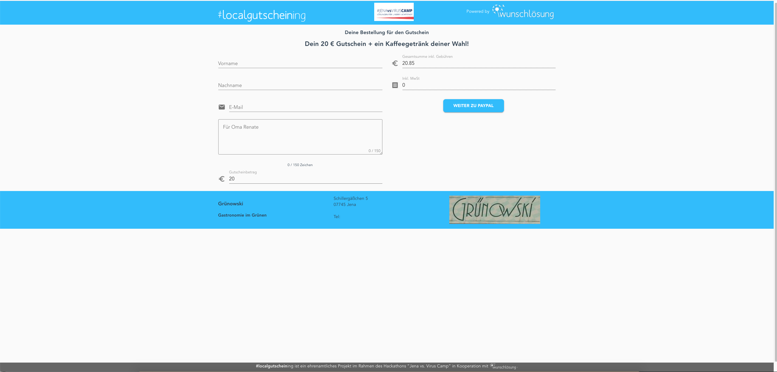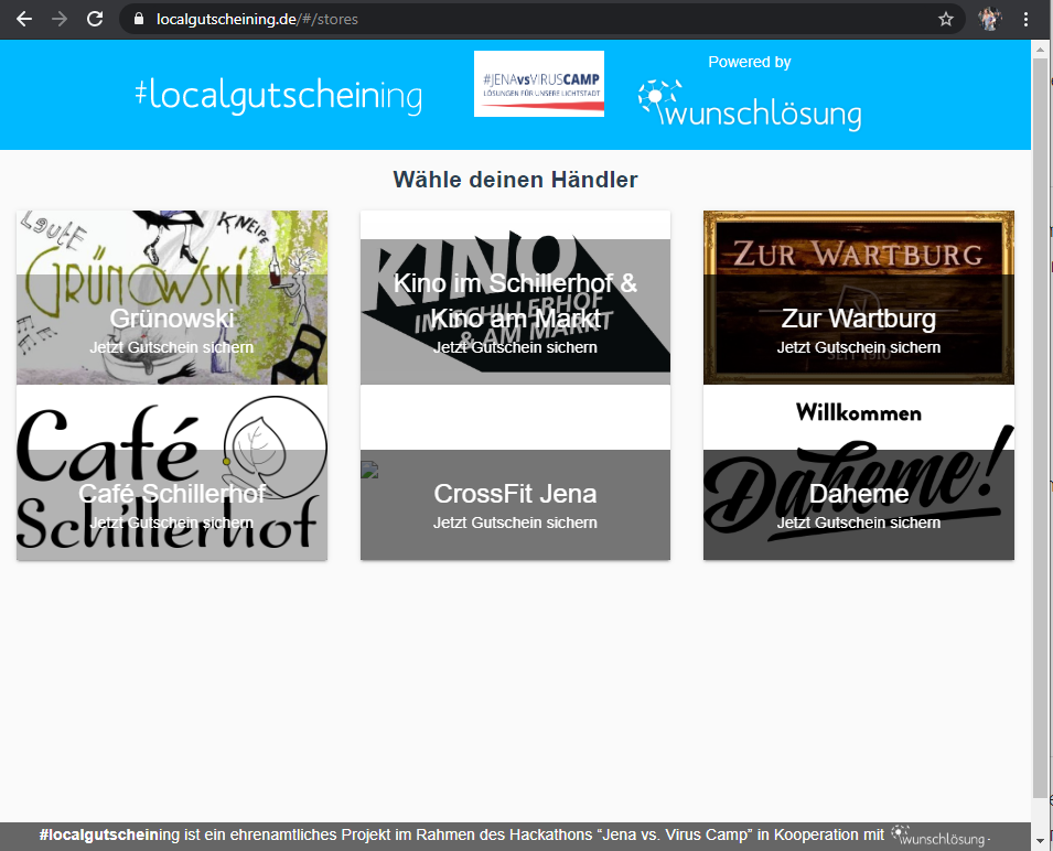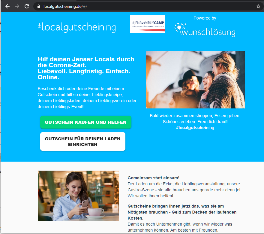 Hi! Wir sind das Team #localgutscheining und haben uns im Rahmen des Hackathons “Jena vs. Virus” kennen und mögen gelernt. Wir betreiben diese Plattform ehrenamtlich, weil wir in Jena auch nach Corona noch unsere Locals vorfinden und mit Ihnen tolle Erlebnisse haben wollen.