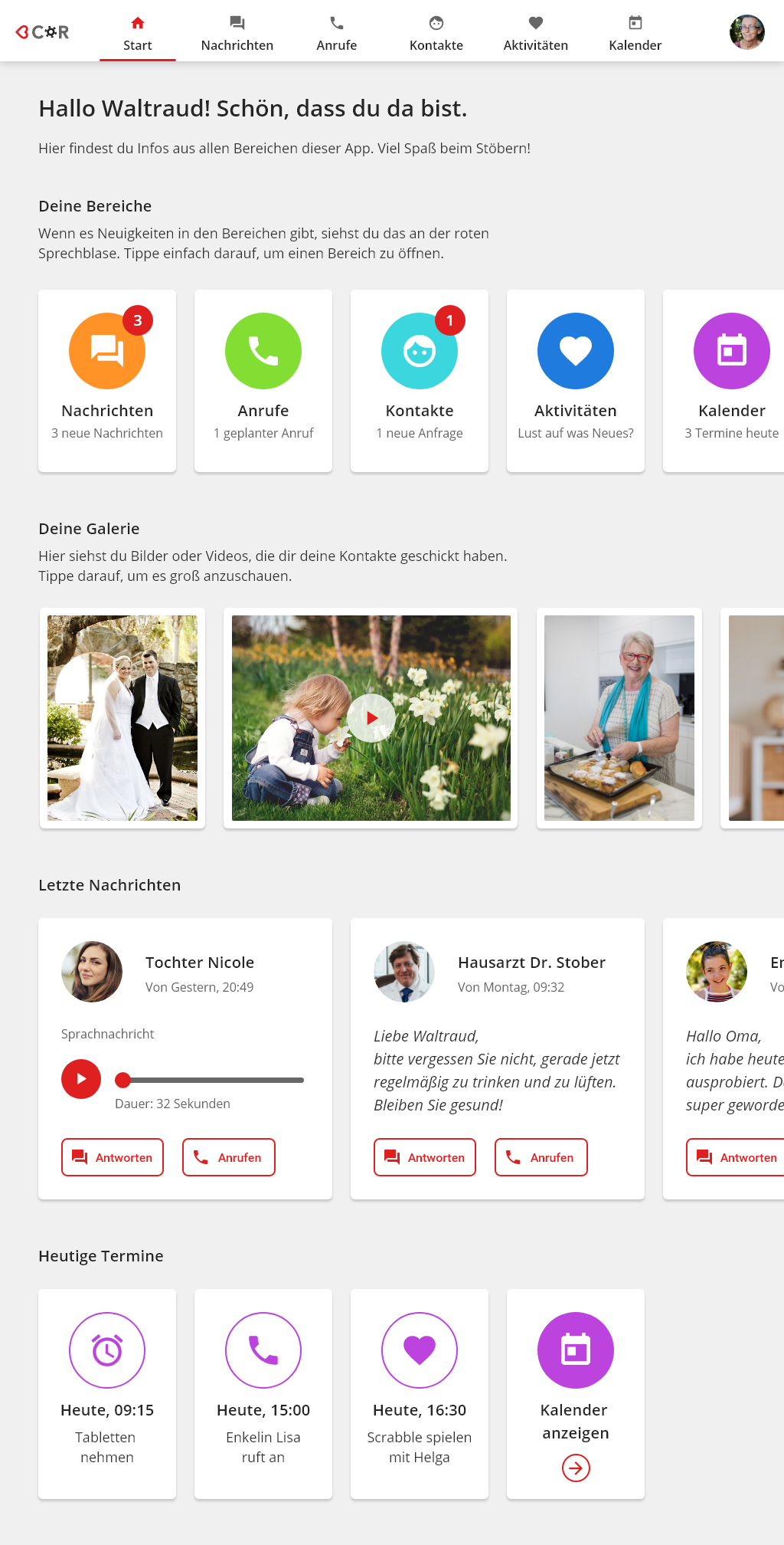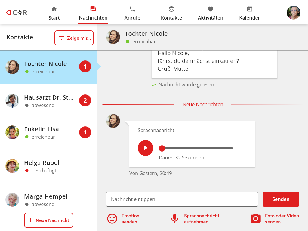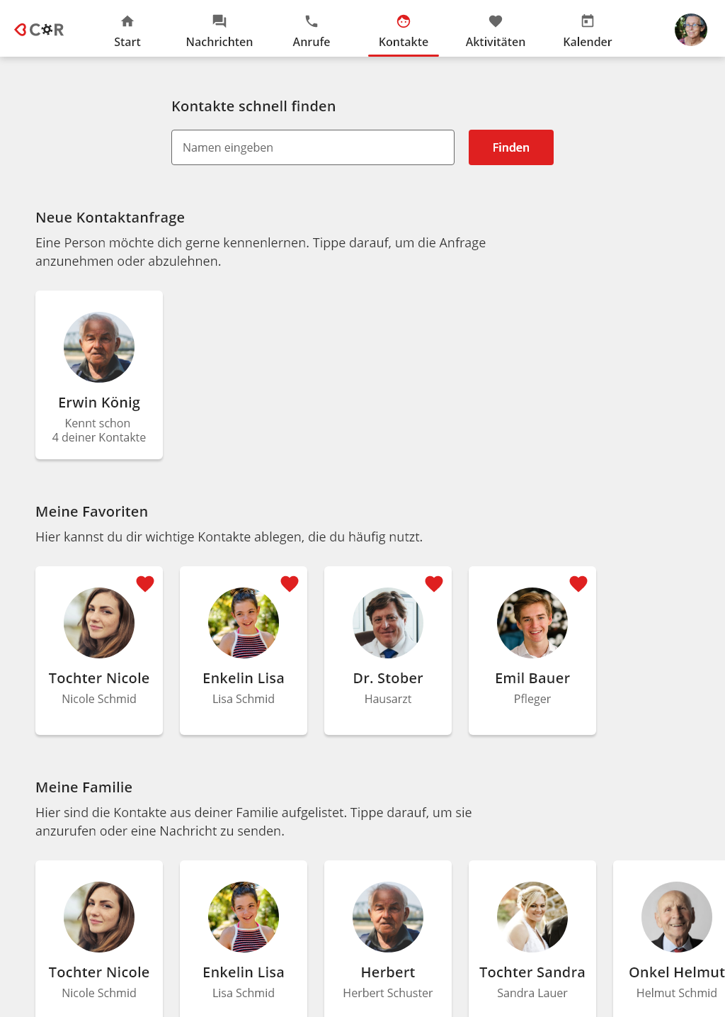 Auch für die wichtigsten Kontakte gibt es in der <3Cor App eine Ansicht. So kann Oma Waltraud schnell ihre Enkelin Lisa finden.
