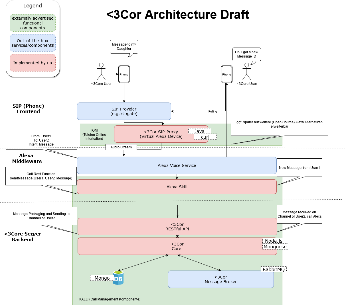 Technisch wird der eingehende Anruf von TONI (Telefon ONline Integration; implementiert mit Java und curl) angenommen. TONI ist eine Anbindung an Alexa Voice Services. Diese übermitteln die Informationen an KALLI, eine Call Management Componente. KALLI enthält den eigentlichen Alexa Skill. Dieser übermittelt über eine REST Schnittstelle die Nachricht. Diese wird verpackt, gespeichert und dann an den gewünschten Empfänger übermittelt (implementiert mit Node.js, Mongoose, MongoDB und RabbitMQ).