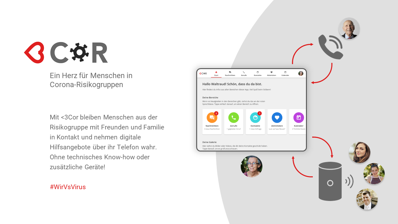 Wir bei <3Cor haben eine Anbindung vom Telefon an Alexa geschaffen und lassen so auch die älteren Generationen an Onlineangeboten teilhaben. Alles, was dafür nötig ist, ist ein Telefonanschluss - ein Medium, mit dem auch ältere Menschen bestens vertraut sind. Per Anruf können später Dienste, wie sie uns von klassischen Smartphone Apps bekannt sind, genutzt werden: Gemeinschaftsspiele, Chat Roulette, Helfer finden, ...