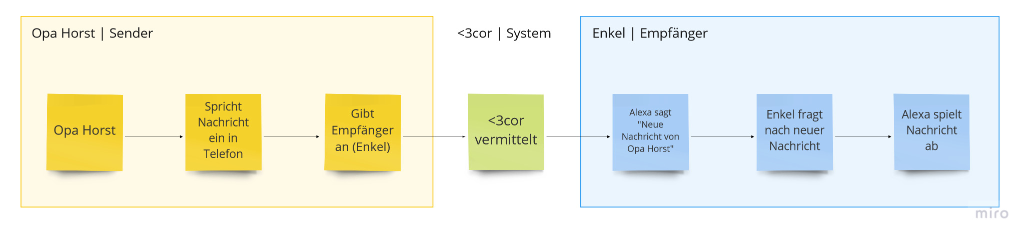 Opa Horst möchte seine Enkel wissen lassen, dass es ihm gut geht und er an sie denkt. Er könnte jeden einzeln Anrufen, aber tagsüber haben sie bei der Arbeit alle keine Zeit. Dank <3Cor greift er trotzdem zum Hörer: Er ruft über eine Telefonnummer bei <3Cor an. Er wird mit Alexa verbunden, identifiziert sich und gibt an, wer seine Nachricht bekommen soll - zum Beispiel alle Enkel. Dann hinterlässt er seine Nachricht, legt wieder auf und lehnt sich entspannt in seinem Sessel am Fenster zurück. <3Cor übermittelt seine Nachricht direkt als Textnachricht an die Messenger seiner Enkel - sie wissen sofort, dass es Opa Horst gut geht!