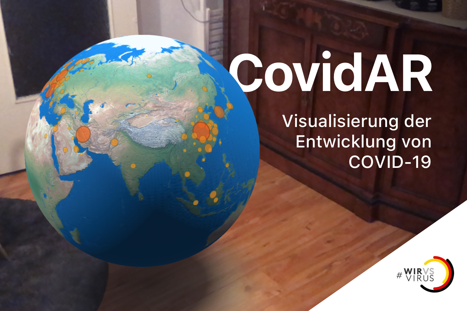 In unserem Lösungsansatz wir Augemted Realtiy (AR) verwendet um die globale Entwicklung der COVID-19 Pandemie zu veranschaulichen. Dem Nutzer wird auf seinem AR-fähigen Endgerät eine Weltkugel angezeigt. Diese kann er in seiner Umgebung beliebig plazieren und skalieren. Auch kann die Weltkugel vom Nutzer beliebig gedreht werden. Überall auf der Weltkugel sind rote runde Indikatoren plaziert. Nähert man sich dem Globus so wird erkennbar das jedem Indikator ein Land zugeordnet ist. Klickt der Nutzer ein Land an, so werden ihm die aktuellen Zahlen der Infizierten, Genesenen und Toten angezeigt. Entfernt sich der Nutzer wieder vom Land kann er jedes andere Land anwählen und erhält auch für dieses Land aktuelle Daten. Zusätzlich kann der Nutzer die Ansicht ändern indem er unten Links auf "Chart" tippt. Ihm wird dann eine Darstellung zum Verlauf der Pandmie als Balkendiagramm angezeigt. Damit wird Corona-Entwicklung als Kurve besser veranschaulicht.
