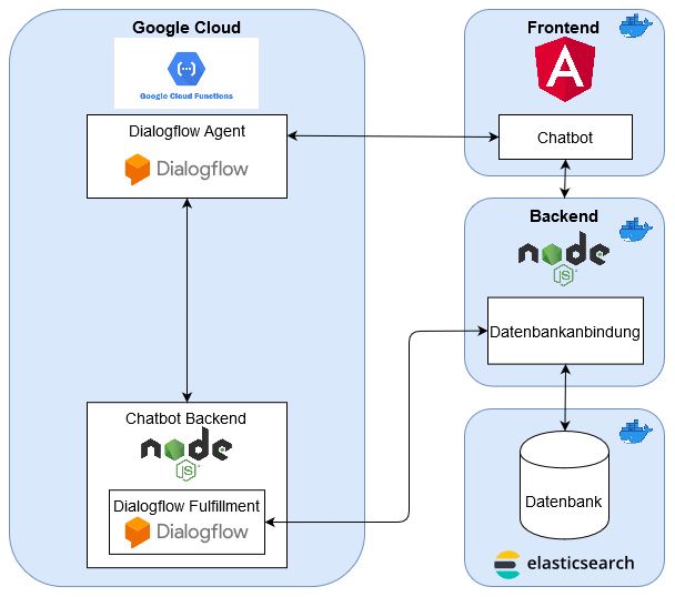 - Google Cloud Platform: Dialogflow Agent + Fulfillment, Google Cloud Function, On-Premise: Kubernetes Cluster, Docker
