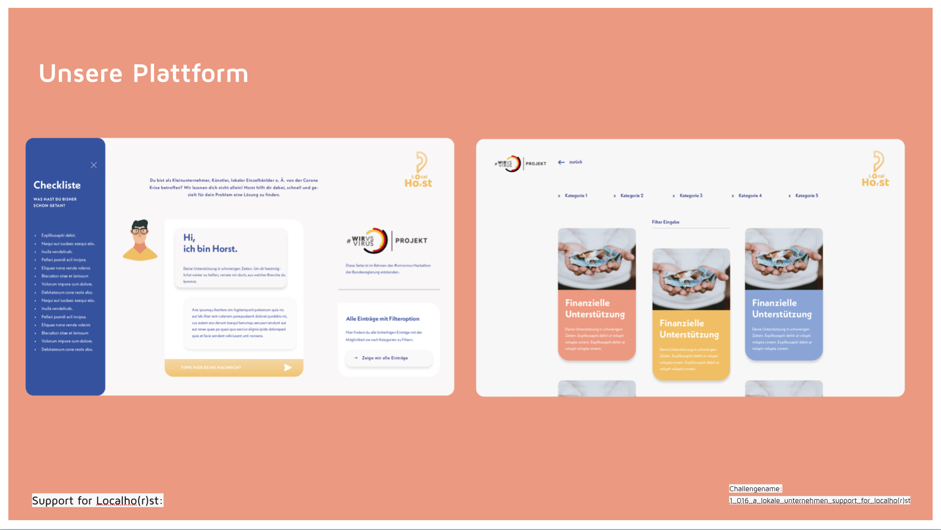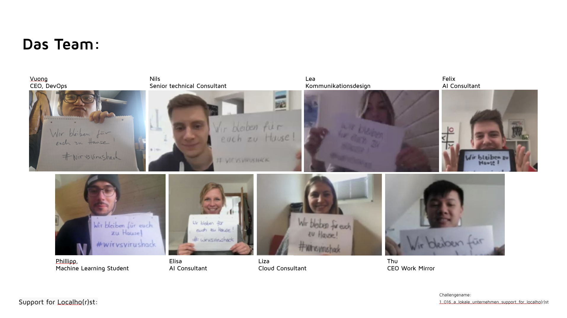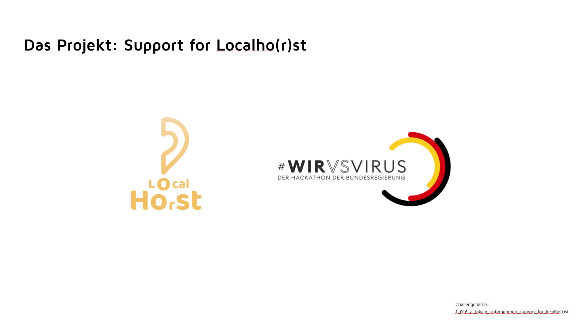 Mit LocalHo(r)st stellen wir eine Plattform bereit, welche wichtige Informationen und Links bündelt und somit Betroffenen die Möglichkeit zur schnellen Selbsthilfe gibt. Wir möchten damit insbesondere kleine und mittelgroße Unternehmen unterstützen, die Coronazeit bestmöglichst zu überbrücken und im Optimalfall sogar gestärkt aus der Krise hervorzugehen. Unsere Plattform ist für jeden nutzbar und freizugänglich: Support for Localho(r)st!