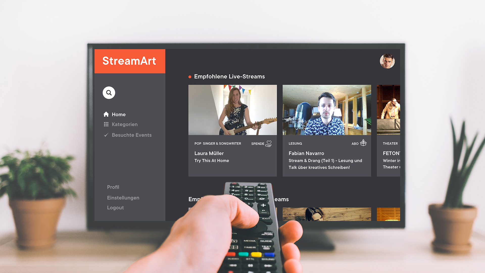 Das Netflix der deutschen Kulturszene. StreamArt bringt Live-Veranstaltungen zu euch ins Wohnzimmer auf der gesamten Welt. Die Erlöse gehen direkt an die Künstler. So bleibt die Kreativität erhalten. Damit Kunst wieder mehr Wertschätzung erfährt. Be smart - StreamArt!