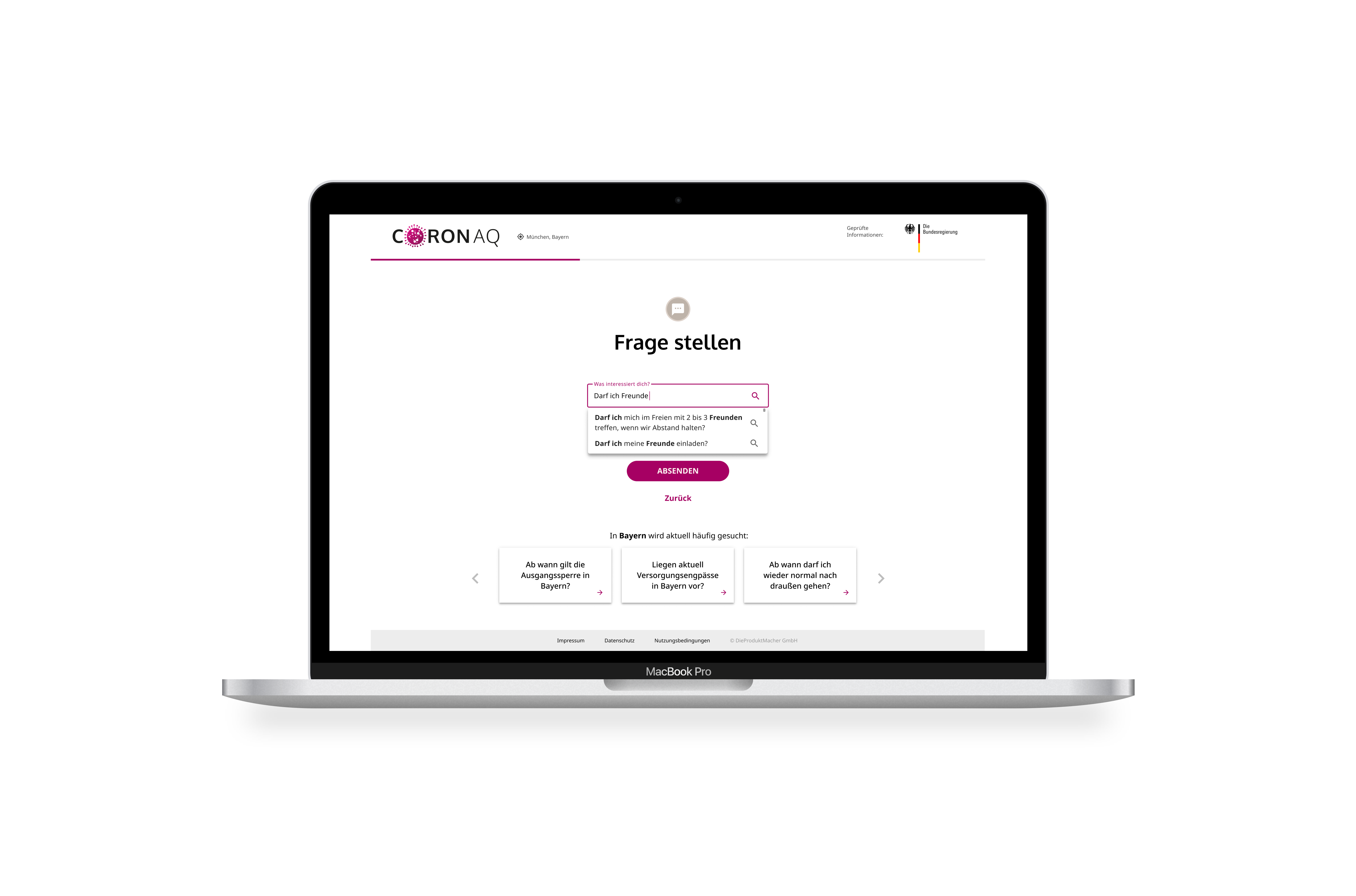 CoronAQ ist eine Webseite, die ihren Nutzern für sie relevante Antworten auf ihre Fragen zu geben. Dabei sind die Antworten aktuell, aus zuverlässiger Quelle und regionalspezifisch. Der Nutzer gibt seine Region und Frage an. CoronAQ liefert die aktuellen rechtlichen Regelungen und ermöglicht, sich zu einer konkreten Fragestellung oder übergeordneten Kategorien zu informieren. Sollte eine Frage mal noch keine Antwort haben, wird diese automatisch von CoronAQ an die entsprechende Stelle weitergeleitet. Sobald es Neuigkeiten gibt, wird der Fragesteller informiert und die Antwort für alle zugänglich gemacht.