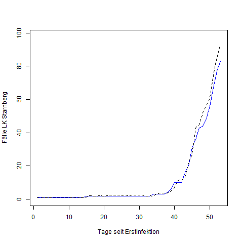 Mit dem Modell erzeugte Daten bilden die Istdaten realistisch ab. Besonders in den letzten Perioden liegen die erzeugten Werte oft über den vom RKI gemeldeten Daten, da Fälle oft nachgemeldet werden. Für die Maßnahmen war kein eindeutiger Effekt ermittelbar – es liegt die Vermutung nahe, dass diese noch nicht lange genug in Kraft sind. Höhere Temperaturen und Sonnenstundenanzahl in den vergangenen Tagen scheinen einen steigernden Effekt auf die Infektionsrate zu haben, was die Theorie der Erhöhung der sozialen Kontakte untermauert. Unser Modell ist hoch signifikant (p=0) und hat gegeben der Datenlage eine beachtliche Erklärungskraft. Da die funktionale Form auf lineare Funktionen beschränkt wurde, ist die Gefahr von Overfitting weniger präsent als mit anderen Schätzmethoden.