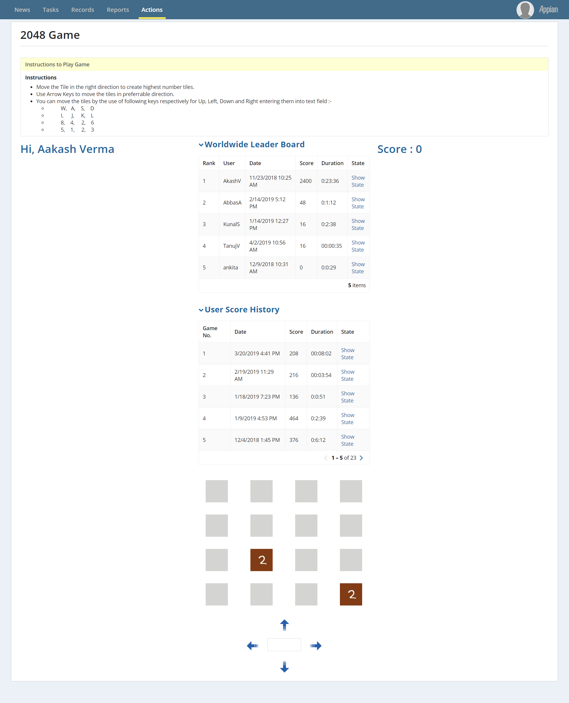 I got inspired from Mobile version of 2048 game and because of I newly joined the organisation and got in touch of Appian BPM so in my training time I developed this project.