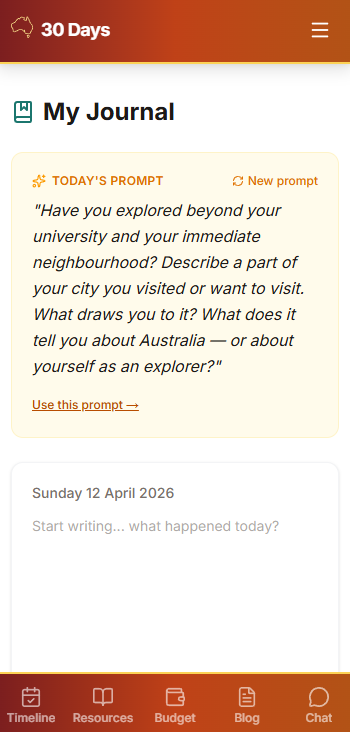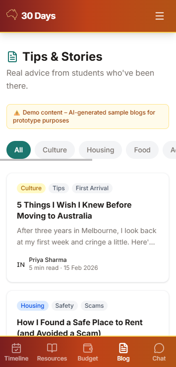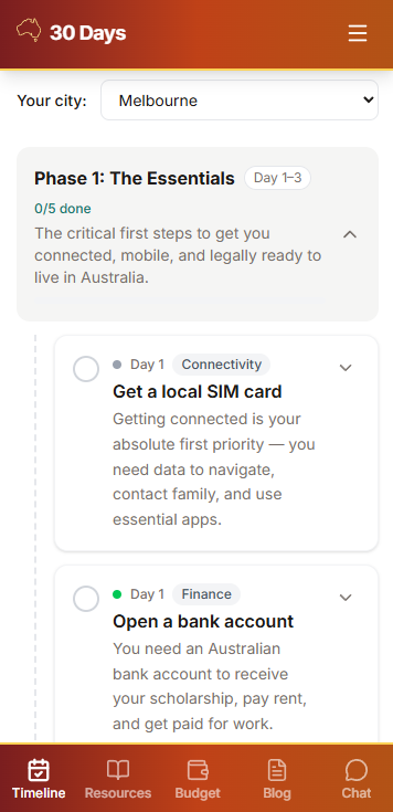 Moving to a new country is overwhelming and we wanted to build an app that guides students through their first crucial 30 days in Australia.