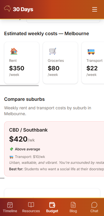 - Budget tools: Weekly cost estimates by city and an interactive calculator with average costs of common suburbs in each state.