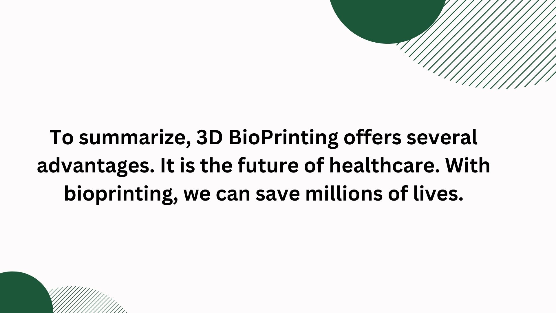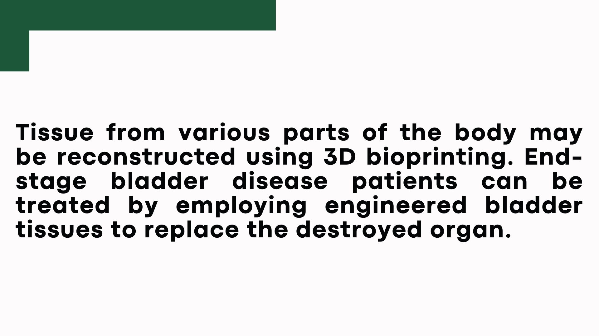 Tissue from various parts of the body may be reconstructed using 3D bioprinting. End-stage bladder disease patients can be treated by employing engineered bladder tissues to replace the destroyed organ. To summarize, 3D BioPrinting offers several advantages. It is the future of healthcare. With bioprinting, we can save millions of lives.