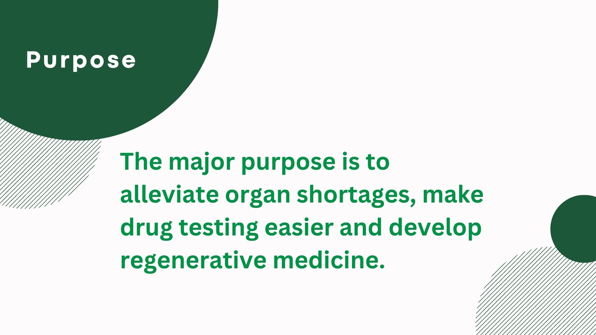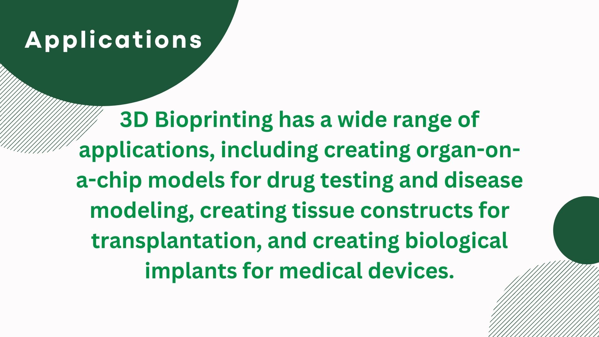 The major purpose is to alleviate organ shortages, make drug testing easier and develop regenerative medicine. 3D Bioprinting has a wide range of applications, including creating organ-on-a-chip models for drug testing and disease modeling, creating tissue constructs for transplantation, and creating biological implants for medical devices.