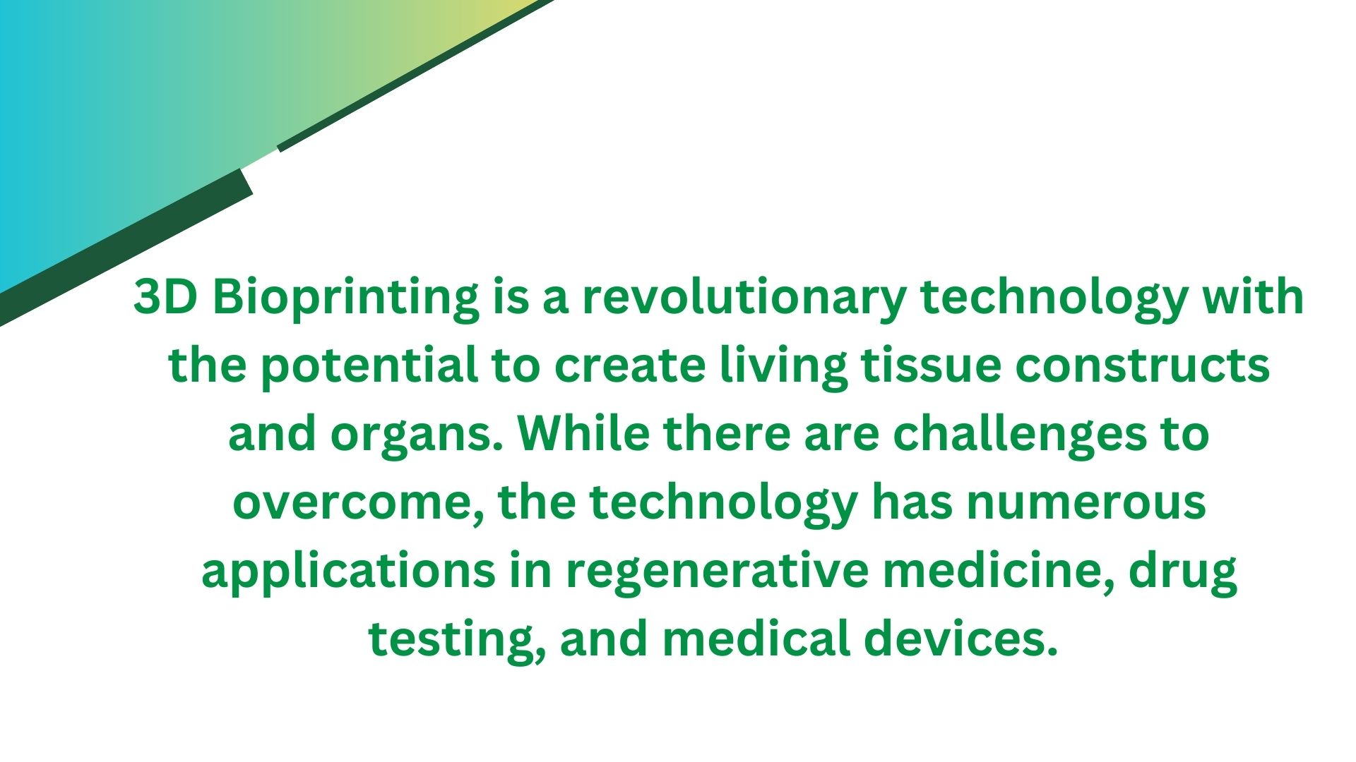 3D Bioprinting is a revolutionary technology with the potential to create living tissue constructs and organs. While there are challenges to overcome, the technology has numerous applications in regenerative medicine, drug testing, and medical devices.