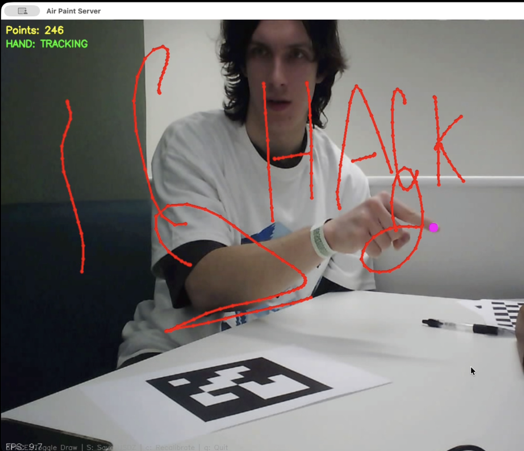 Python + OpenCV for stereo vision. MediaPipe for hand tracking. ArUco marker to anchor the world origin. Swift + ARKit to render strokes on iPhone. WebSocket to stream points in real-time.