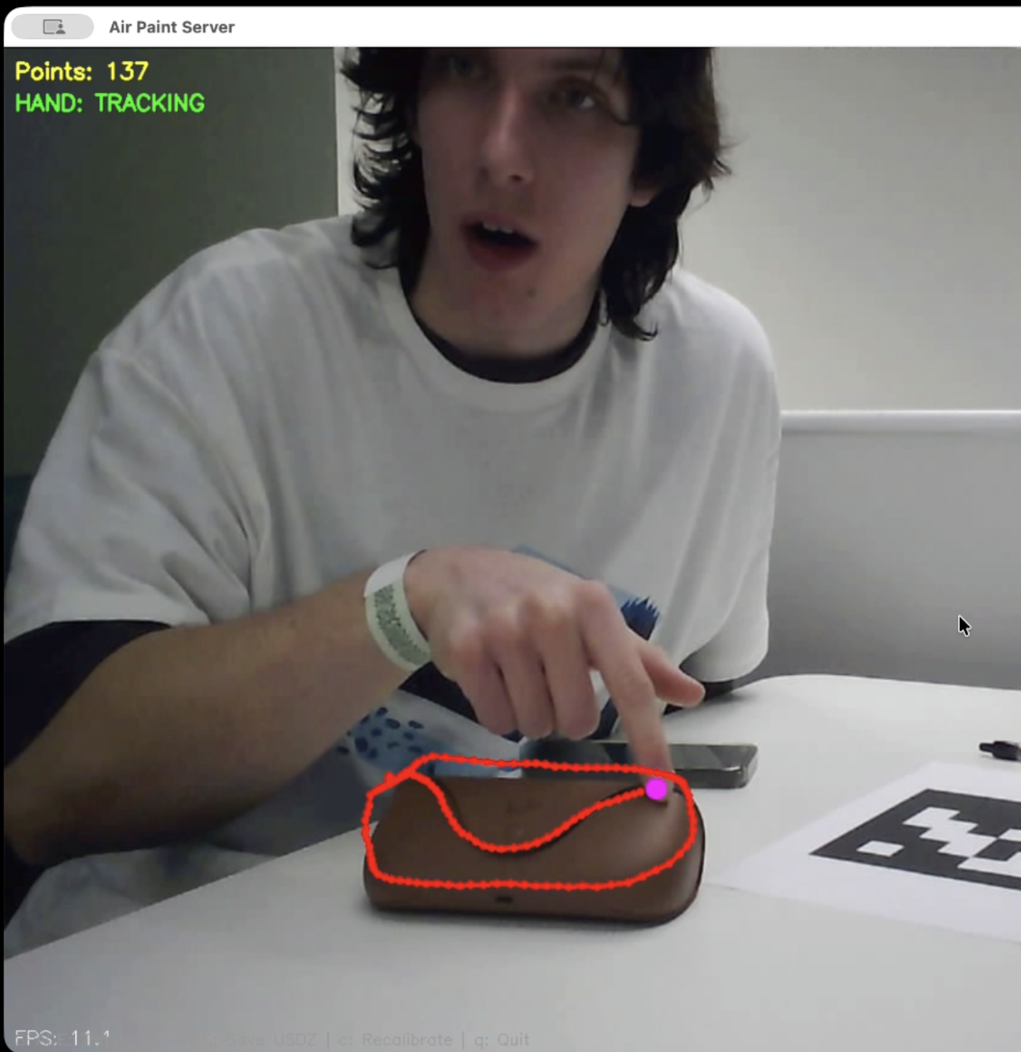 Draw in mid-air with your finger. Two webcams triangulate your fingertip in 3D. See it live on your iPhone in AR. Export to USDZ for sharing or 3D printing.