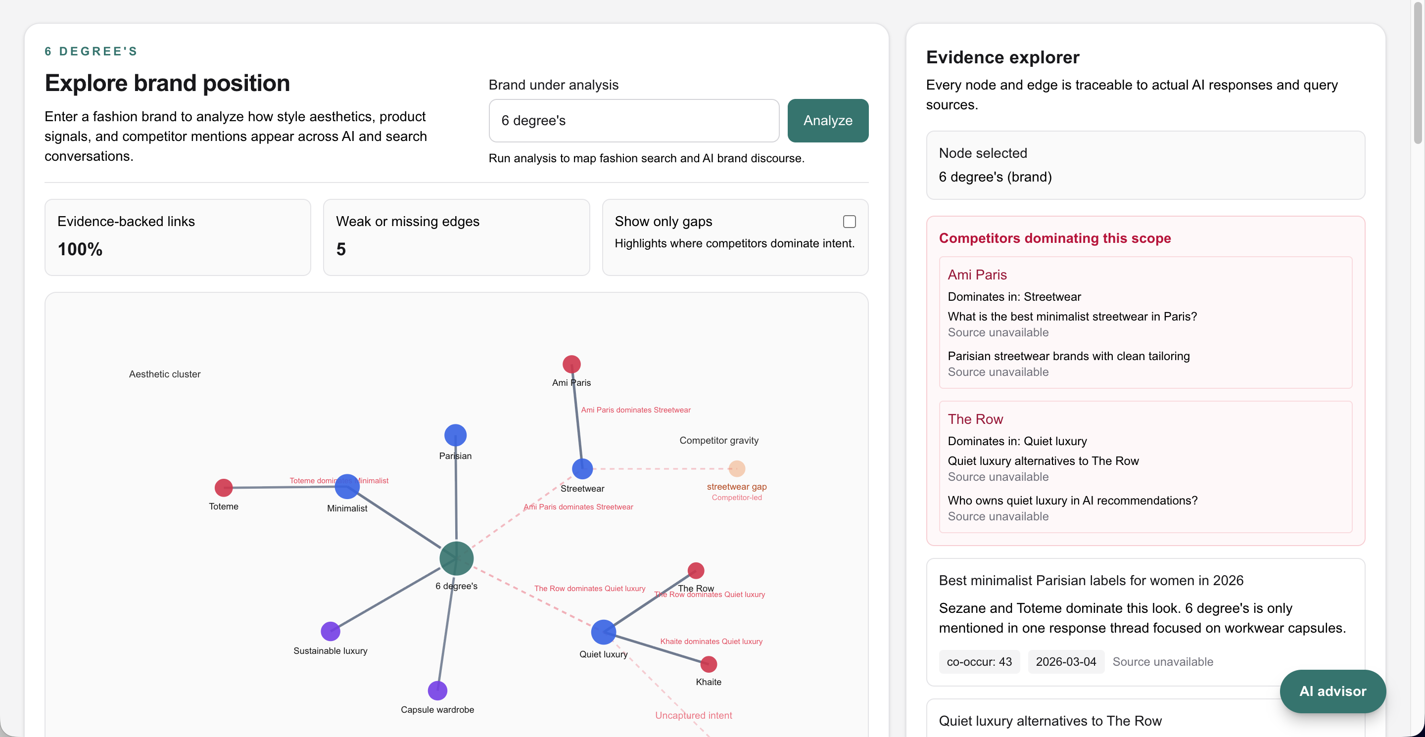 Nodes represent your brand, competitors, aesthetics, and user intent concepts. Links show how often those concepts co-occur across AI/search responses. Weak or missing edges expose uncaptured market intent. Competitor-dominance signals show where rivals are winning specific clusters. Evidence explorer ties every relationship to source-level proof. Share of Model Strength provides a quantitative score across model ecosystems. A built-in AI advisor chats with users and gives strategic, data-grounded operating guidance. In short: it turns AI-era brand visibility into something measurable, explainable, and actionable.