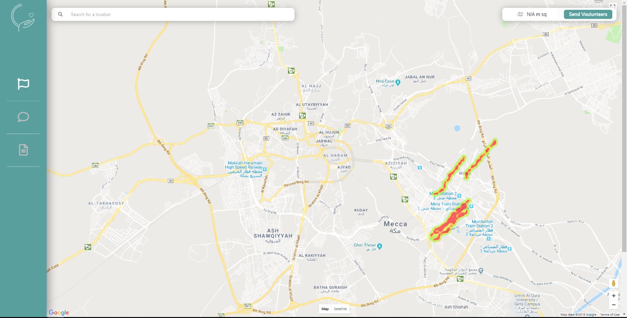 The system mainly detects, using heat maps, locations where pilgrims density is high; and notify volunteers that there is help needed at that location. In addition, it helps with coordinating volunteers based on their skills and organizations.