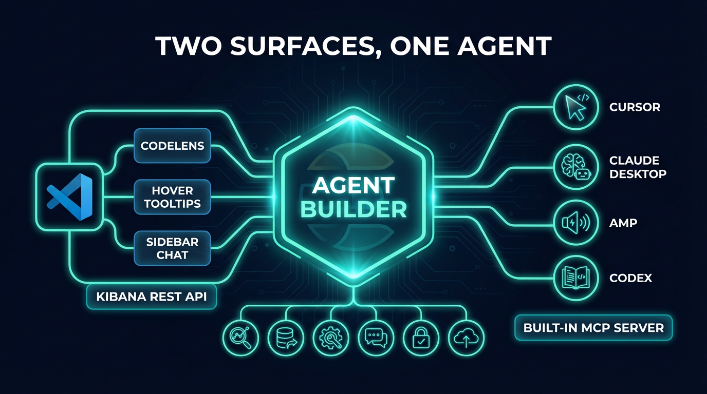 Elastic Lens bridges production data in Elasticsearch with coding environments through two interfaces, powered by a single Elasticsearch Agent Builder agent: