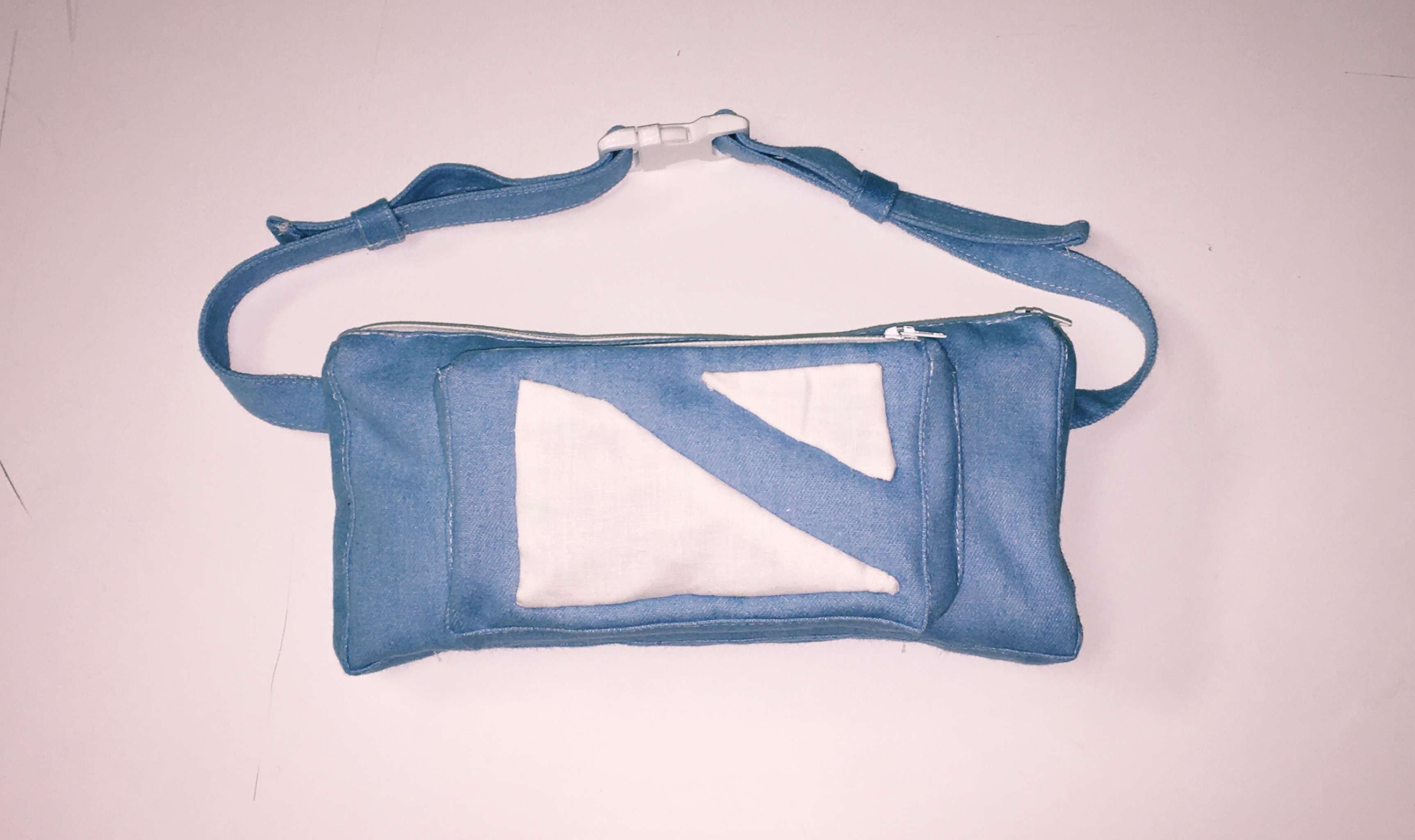 We started by pattern drafting the bag, using our own cosmetic bags as models. We then sewed the bag in brushed denim fabric. No webbing buckle was available so we 3D printed it. Meanwhile, a group member did the coding for the light sensor. Initially, we wanted to include the sensor in between the fabric and the lining of the smaller pocket, but we realized the fabric was too thick. Instead, we included the Adafruit Circuit Playground and the battery in a small design detail on the front of the bag.