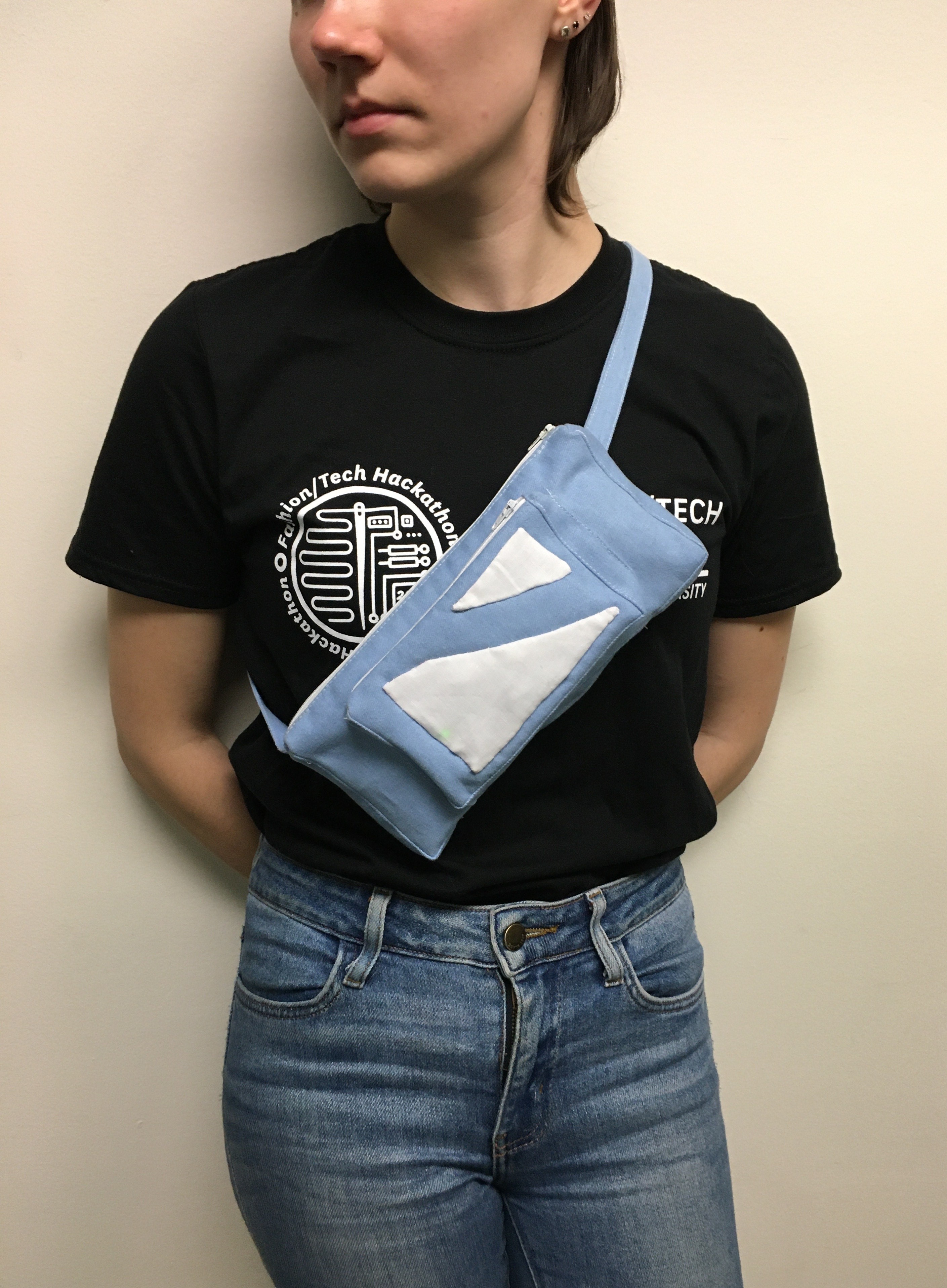 Since all the group members are fashion design students, we do not have experience with coding and developing wearable technologies. As a result, we had to change our ideas many times to simplify the technological aspect of our product. Initially, our goal was to create a bag with a proximity sensor that would trigger vibrations in the bag. It would have been accessible to a wider range of customers such as people with a hearing disability. The vibrations would also only alert the wearer and be very discreet. We simplified our product because we did not have the knowledge to program this functionality. Furthermore, we did not know how to draft and sew bags, so we had to figure it out based on the bags we had with us.