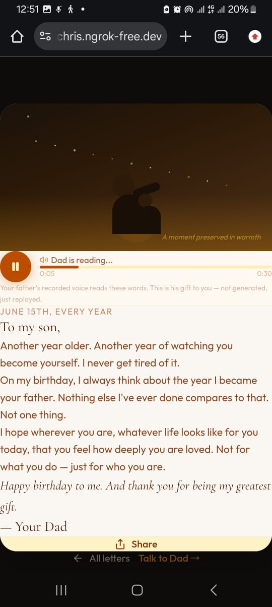 - Sealed Letters - time-locked voice messages that unlock on a specific date or milestone: "Open on your wedding day." "Open when you need me."