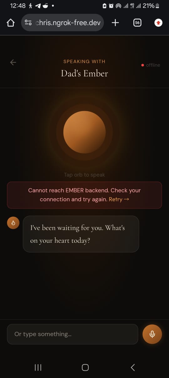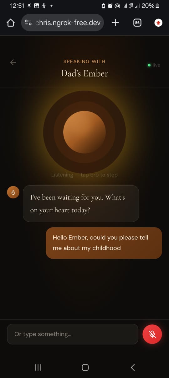REAL-TIME VOICE LAYER (Gemini Live API): The heart of EMBER is a WebSocket-based real-time audio pipeline using gemini-2.5-flash-native-audio-latest. When a family member opens the Companion view, they're talking directly to a live Gemini session, with bidirectional audio, natural interruptions, genuine conversation. Not turns. Not text boxes. A real exchange.